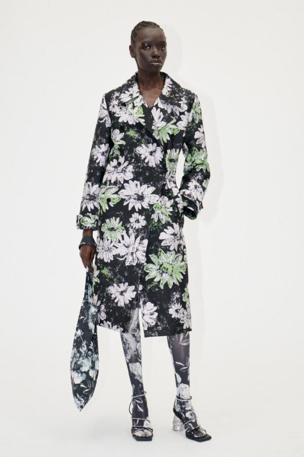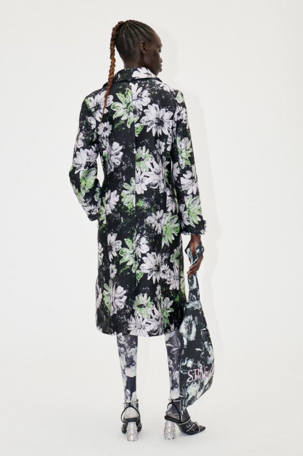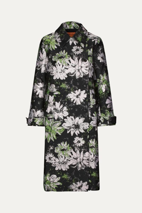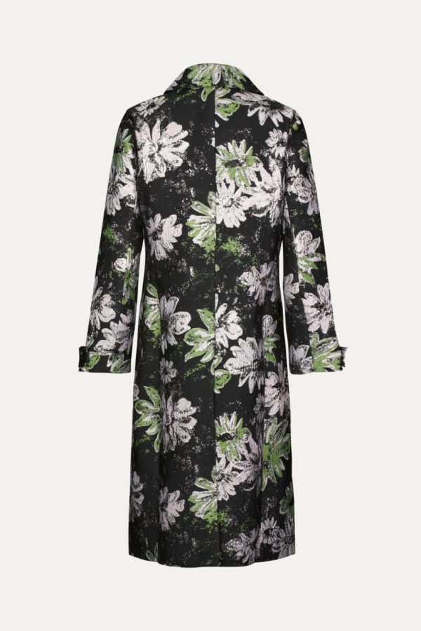 Double breasted midi coat with pockets, long cuffed sleeves and metallic floral pattern. Recycled Polyester blend. Layer over your favourite look from the collection.