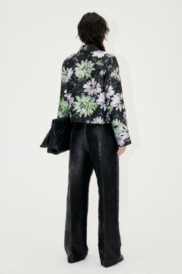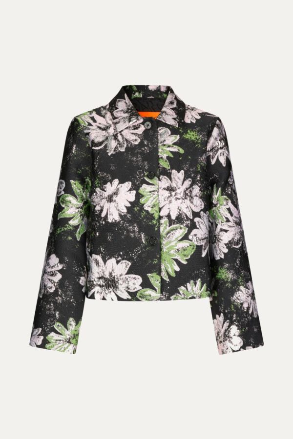 Semi-cropped button up jacket with long sleeves, collar and metallic floral pattern. Recycled Polyester blend. Fully lined with 100% Recycled Polyester. Pair with the Peter Skirt in Grey Wash.