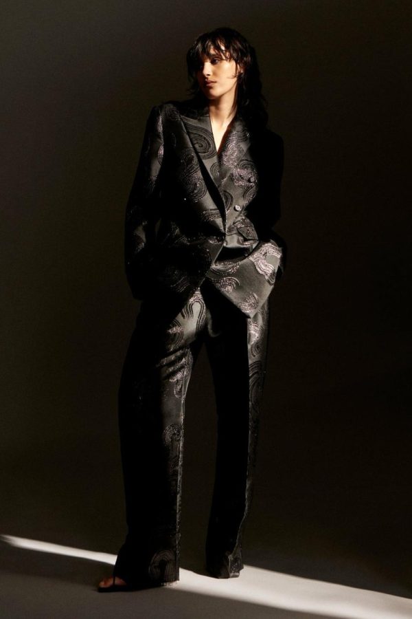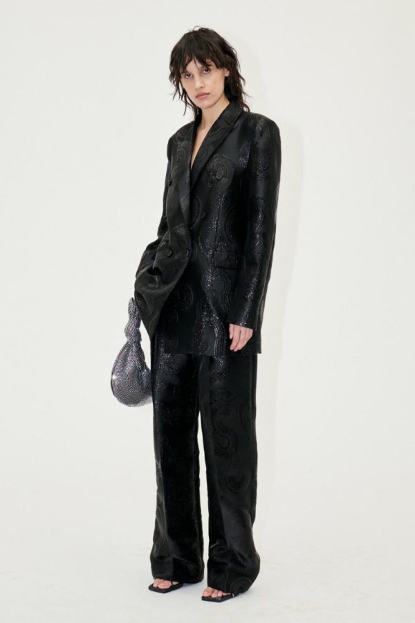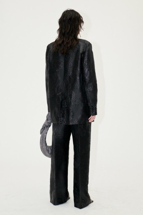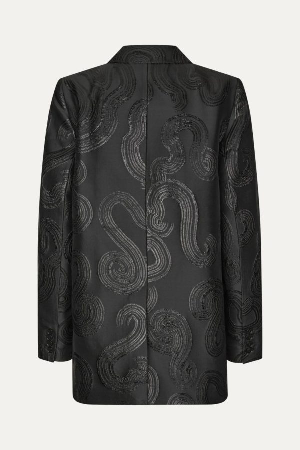 Structured double breasted blazer with an oversized silhouette and monochrome metallic pattern. Pair with the Ciara Pants in Swirl.
