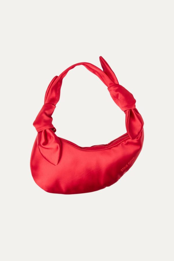 Mini hobo style shoulder bag with knotted top handle, bright silky material and spacious zippered pocket.
