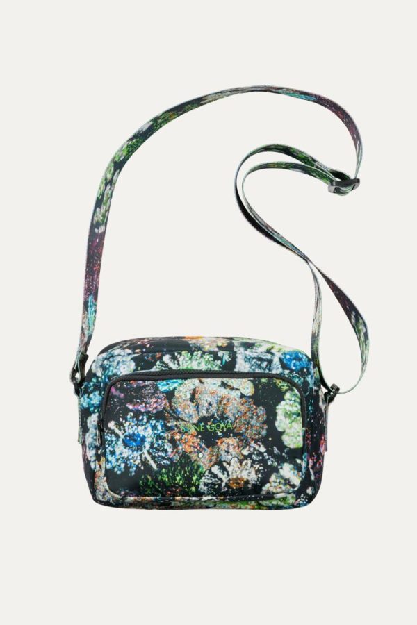 Squared cross body bag with zip pockets, adjustable strap and sparkling floral pattern.