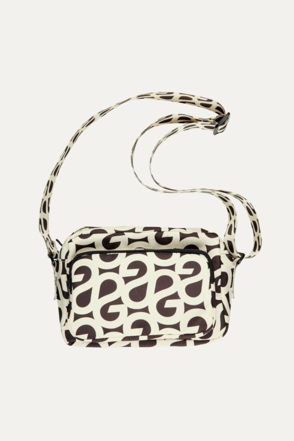 Structured cross body bag with zip pockets, adjustable strap and STINE GOYA logo pattern. 100% Recycled Polyester.
