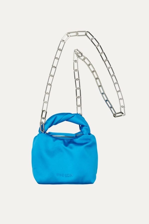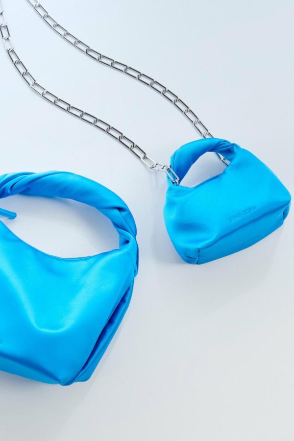 Slouched micro bag with twisted top handle, cross body chain strap and zippered pocket. Soft satin material.