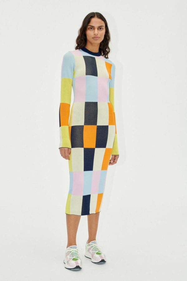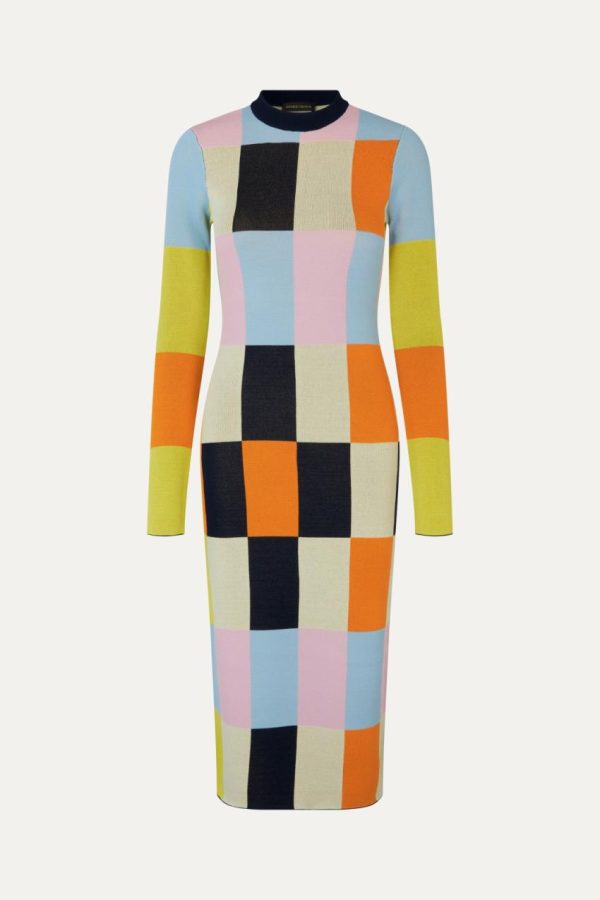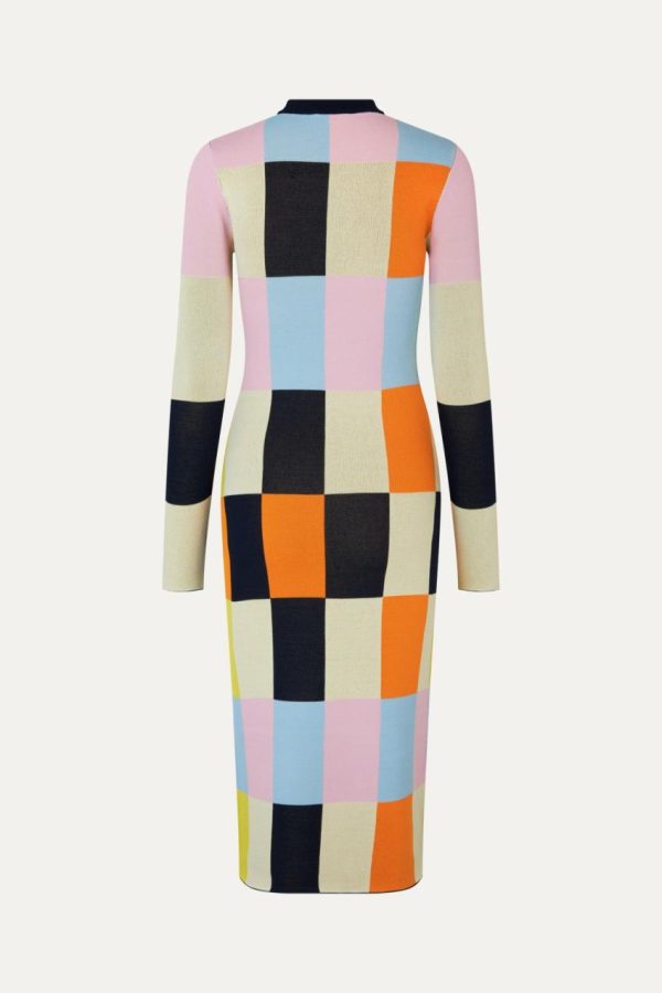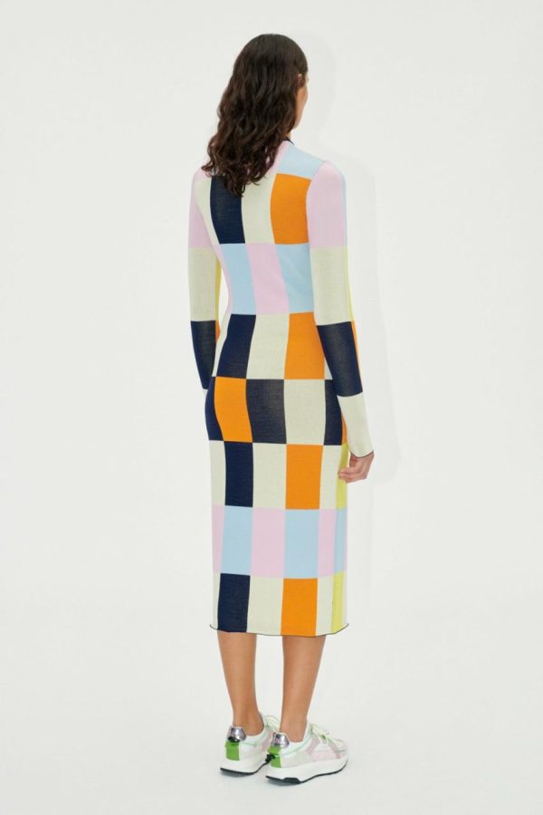 Lightweight mid-length knit dress with a fitted silhouette, long sleeves and high collar. Colour blocked check pattern. Pair with your favourite accessories from the collection.