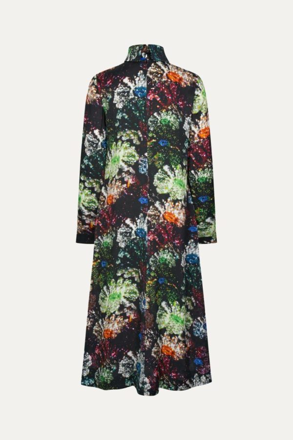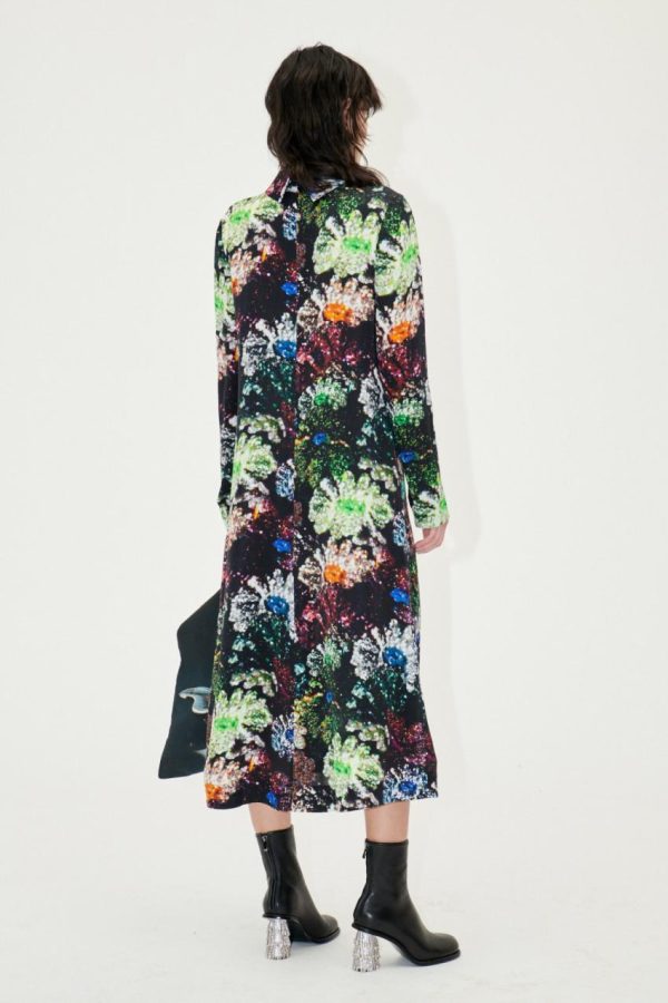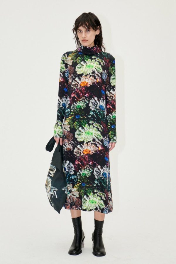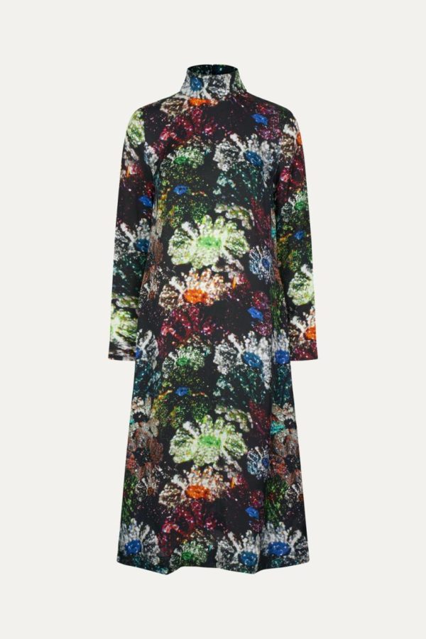 Long sleeved mid-length dress with a turtleneck, flowing a-line silhouette and a vivid metallic floral pattern. Pair with the Gurly Shoes in Jet Black.