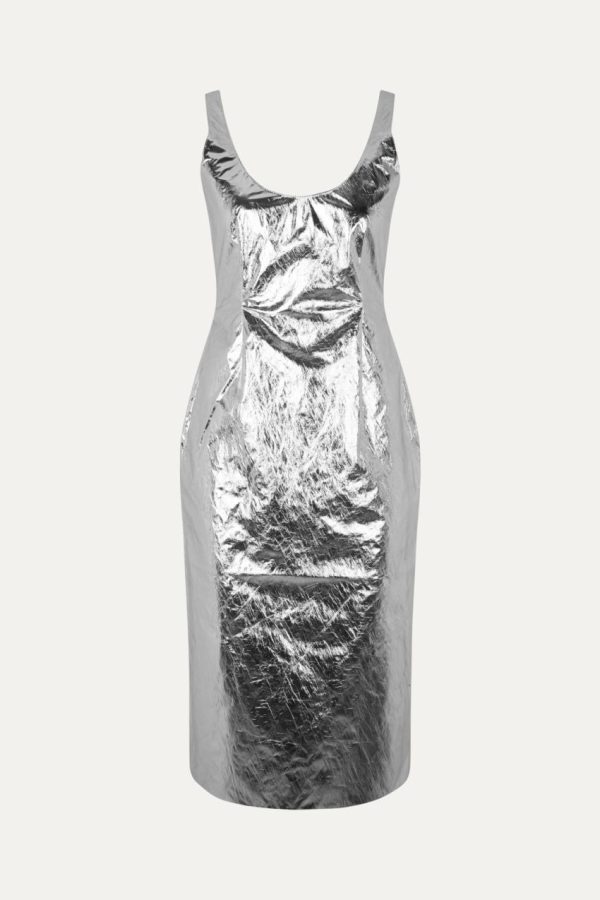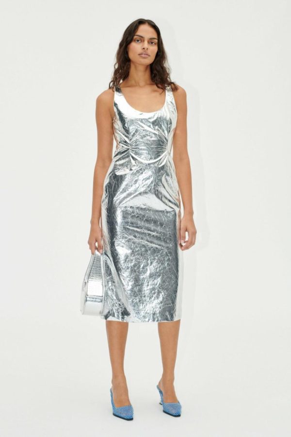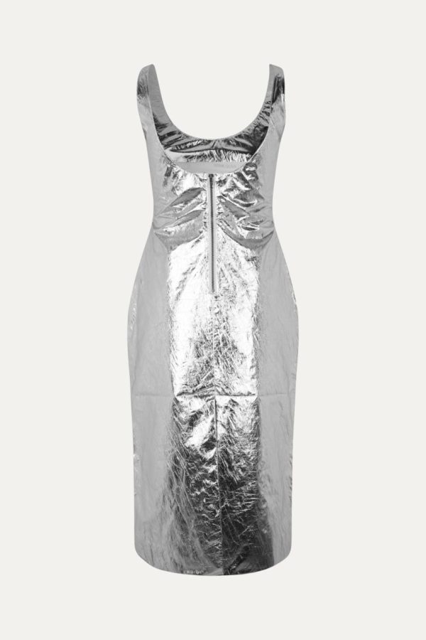 Elegant mid-length sleeveless dress with plunging scoop neckline at front and back. Elegant crinkled silver material. Fully lined with 100% Recycled Polyester. Pair with the matching Rocky Jacket in Silver and your favourite heels from the collection.