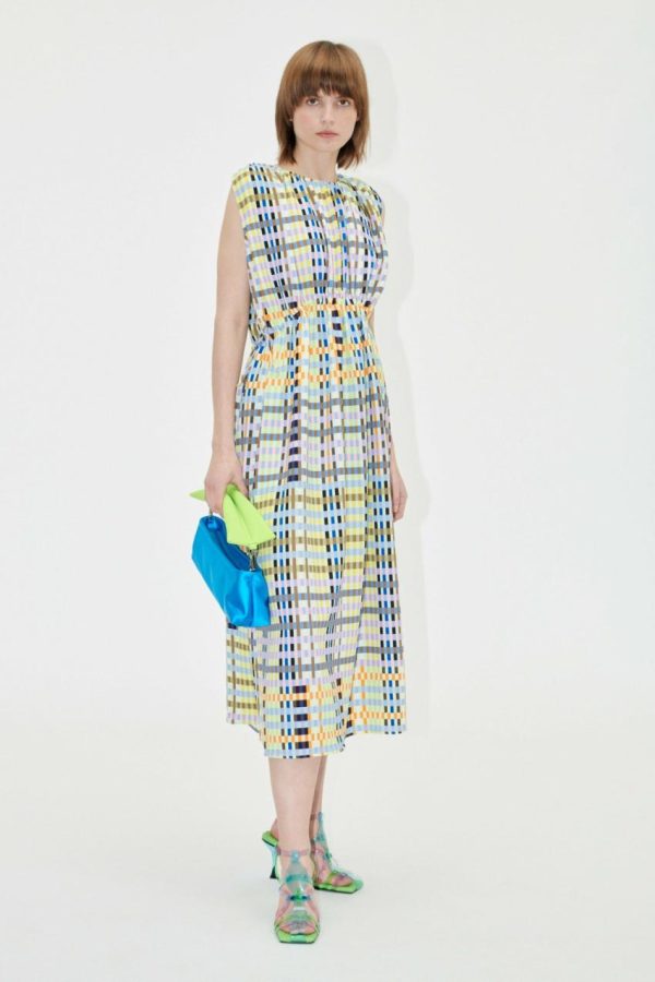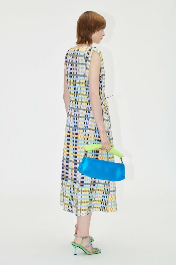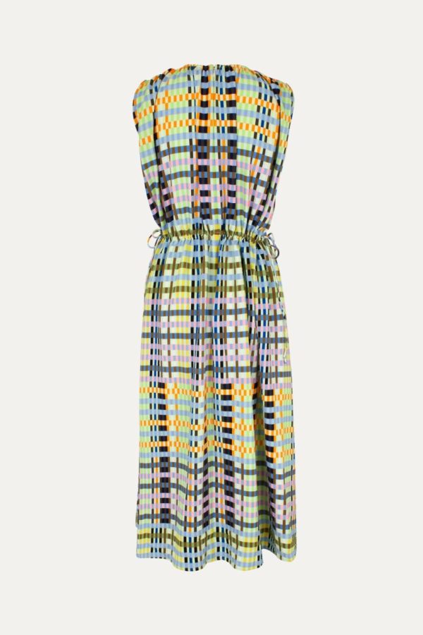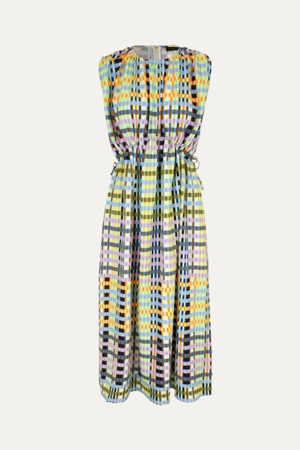 Mid-length sleeveless dress with cinchable waist, elegant ruching and checked pattern. Recycled Polyester blend. Pair with the Crystal Shoes in Marina.