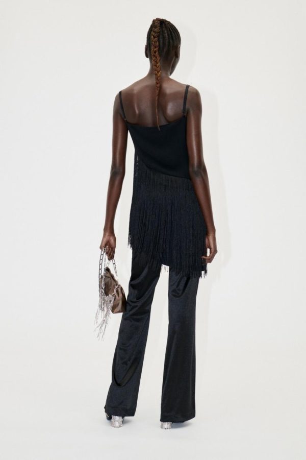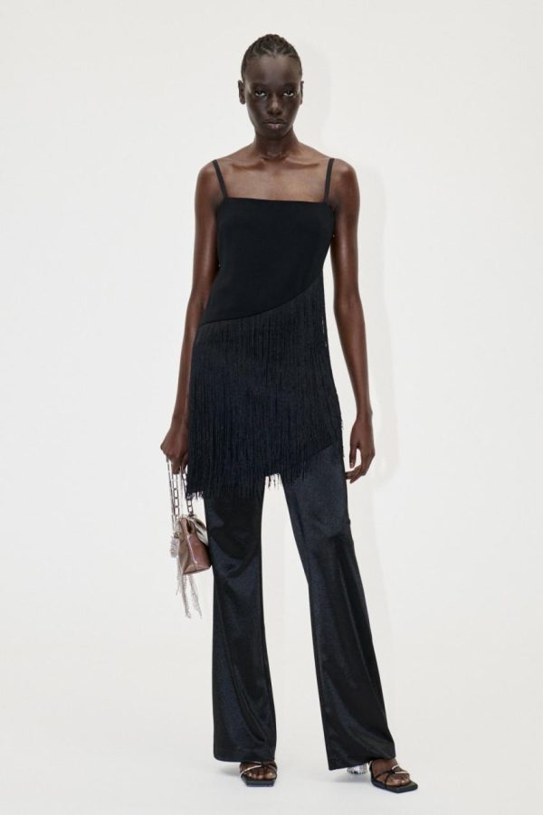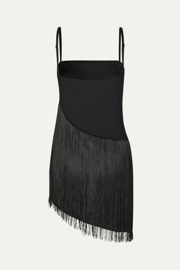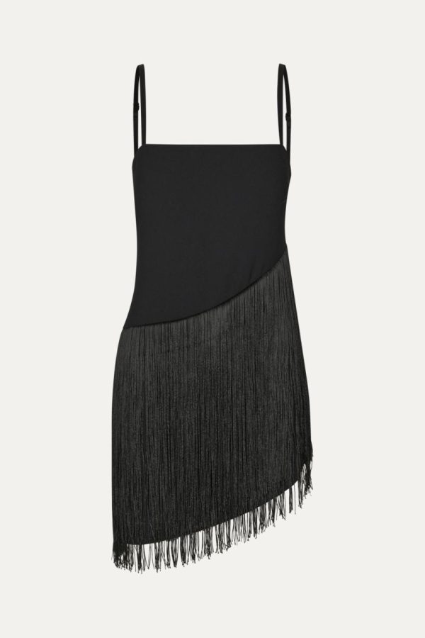 Slim fitting sleeveless mini dress with thin adjustable straps, asymmetrical hem and shiny fringe skirt overlay. Pair with the Piza Heels in Jet Black and the Cruz Bag in Lunar Pink.