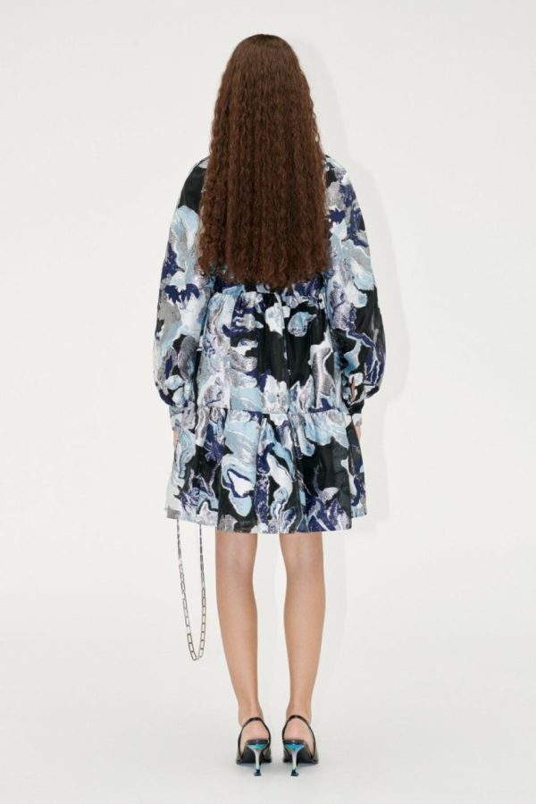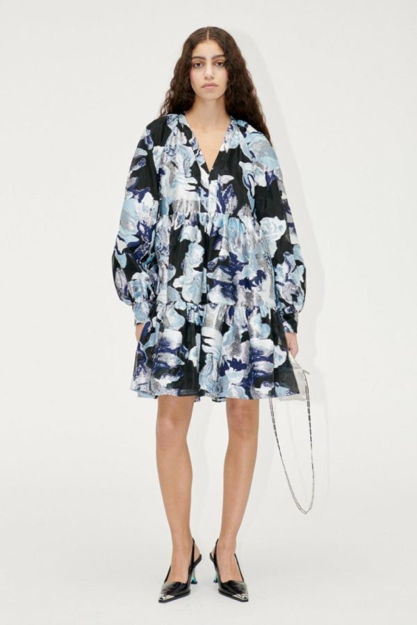 Voluminous tiered mini dress with long sleeves, V-neck and metallic abstract pattern. Recycled Polyester blend. Pair with the Eiffel Shoes in Black Holographic.