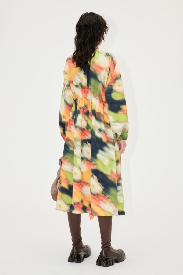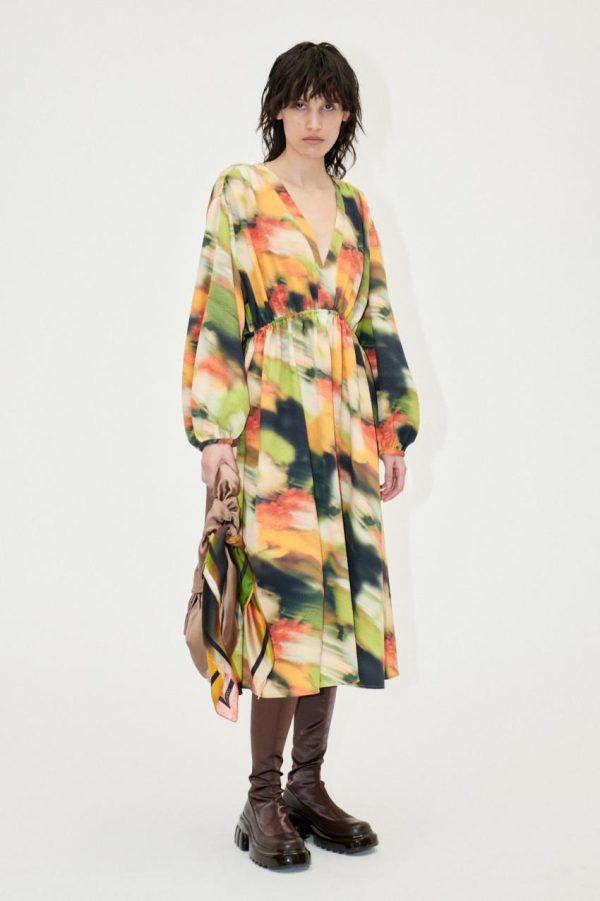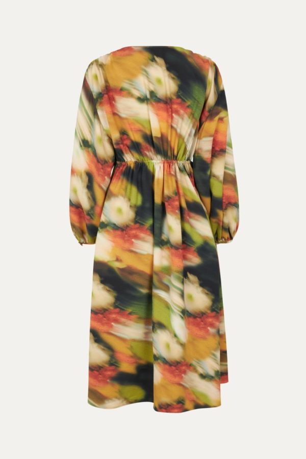 Floral midi dress with V-neck, cinchable waist with pleats and long sleeves. Recycled Polyester blend. Pair with the Allison 2.0 Boots in Jet Black.