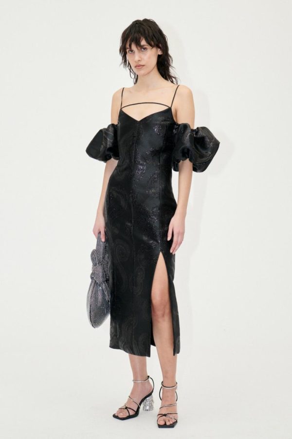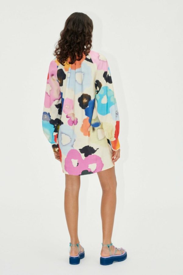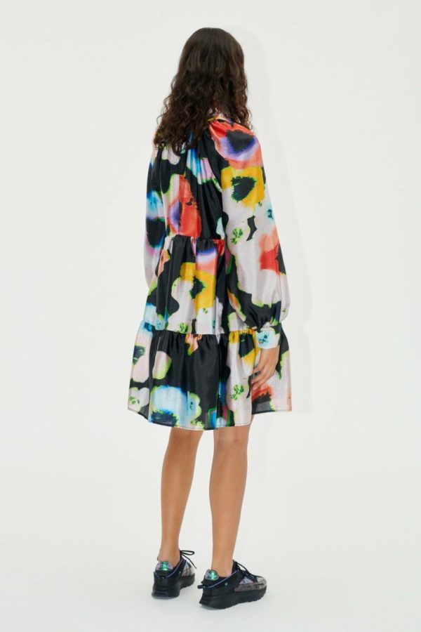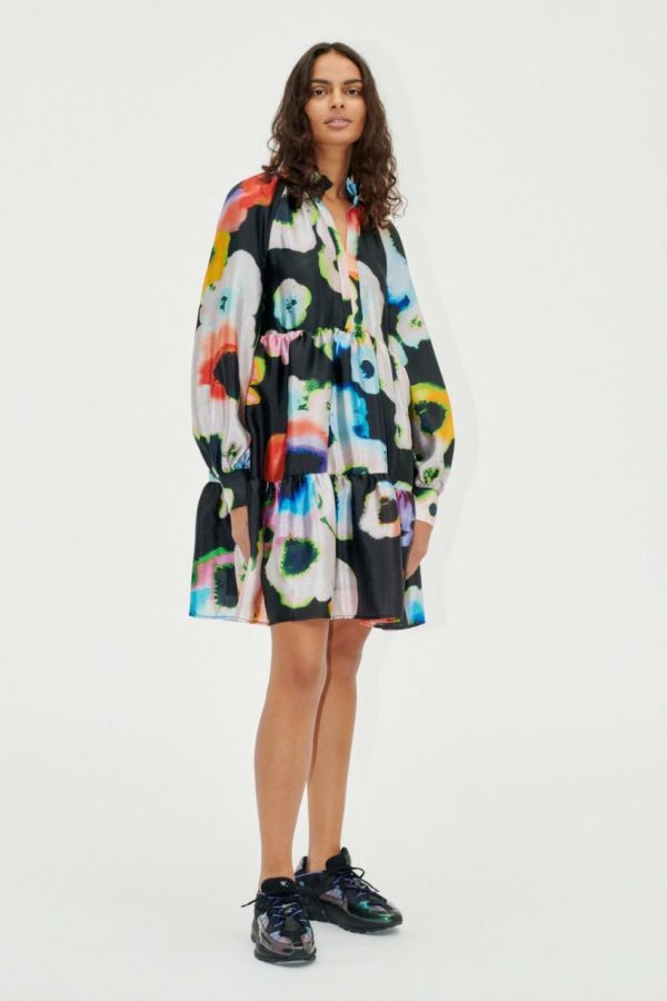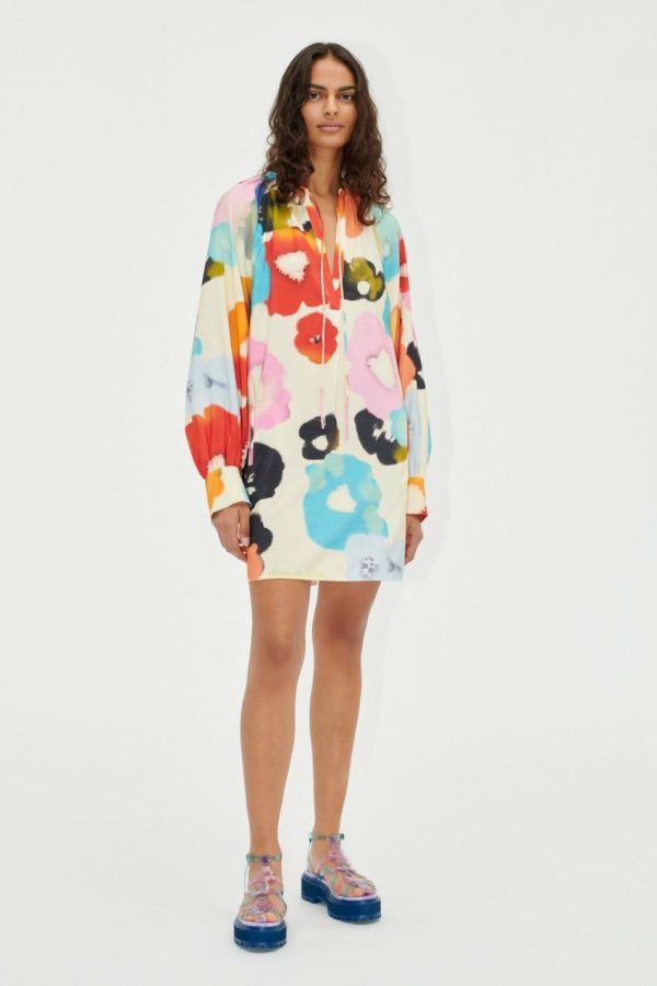 Tiered mini dress with voluminous long sleeves, pockets and a ruched neckline. Pair with your favourite accessories from the collection.