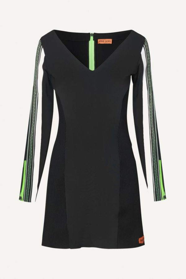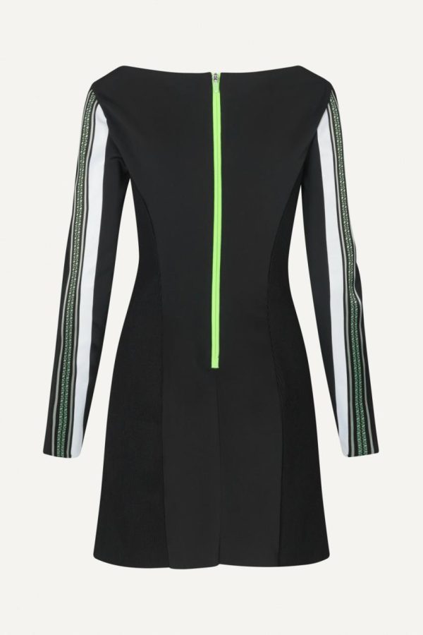 Fitted mini dress with V-neck, back zip closure and long sleeves with reflective striped pattern and zip detail. Recycled Polyamide blend. Pair with the Eiffel Heels in Silver.