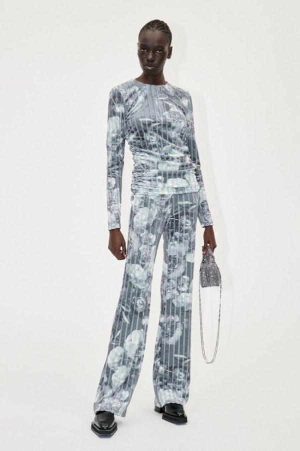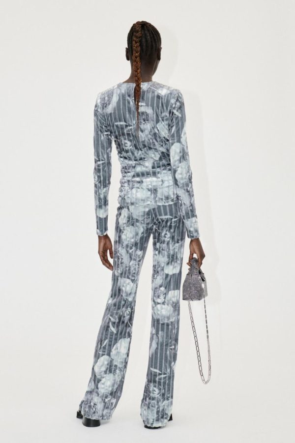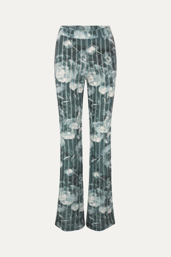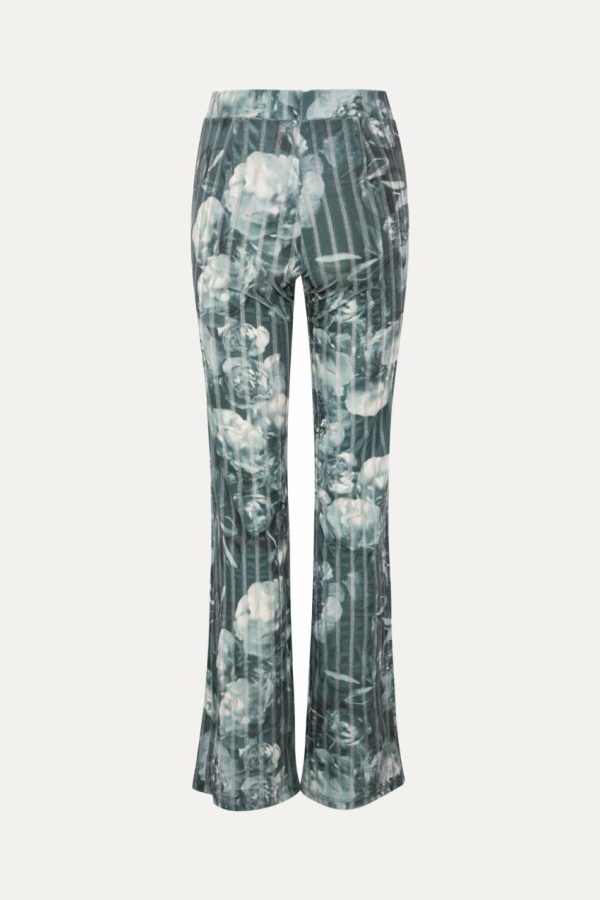 Stretchy straight leg pants with a slight flare, floral pattern, metallic silver stripes and high waistband. Recycled Polyester blend. Pair with the Margila Top in Metalized Peonies.