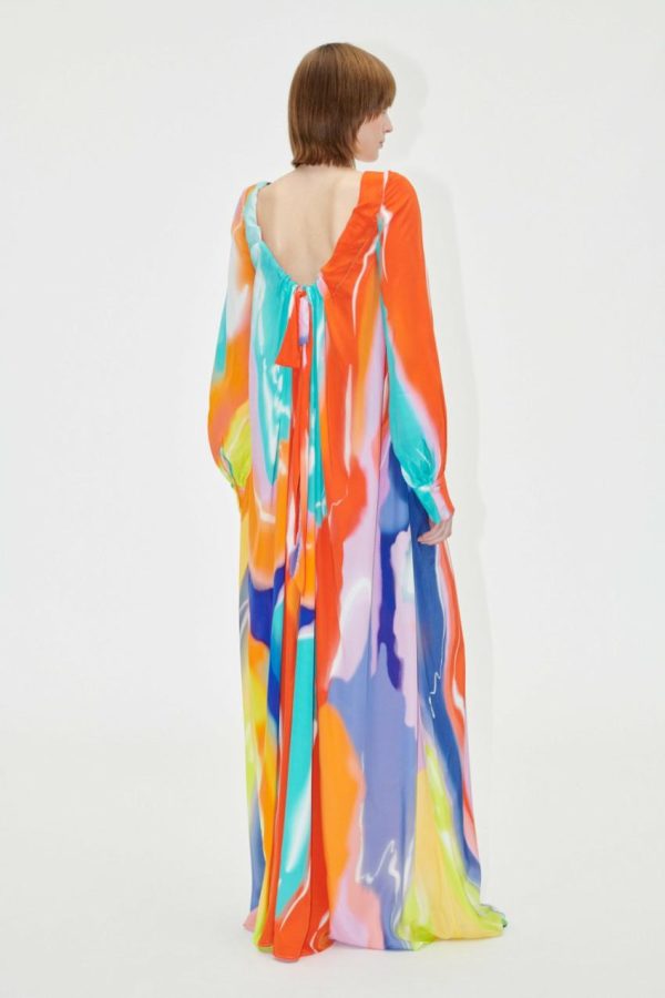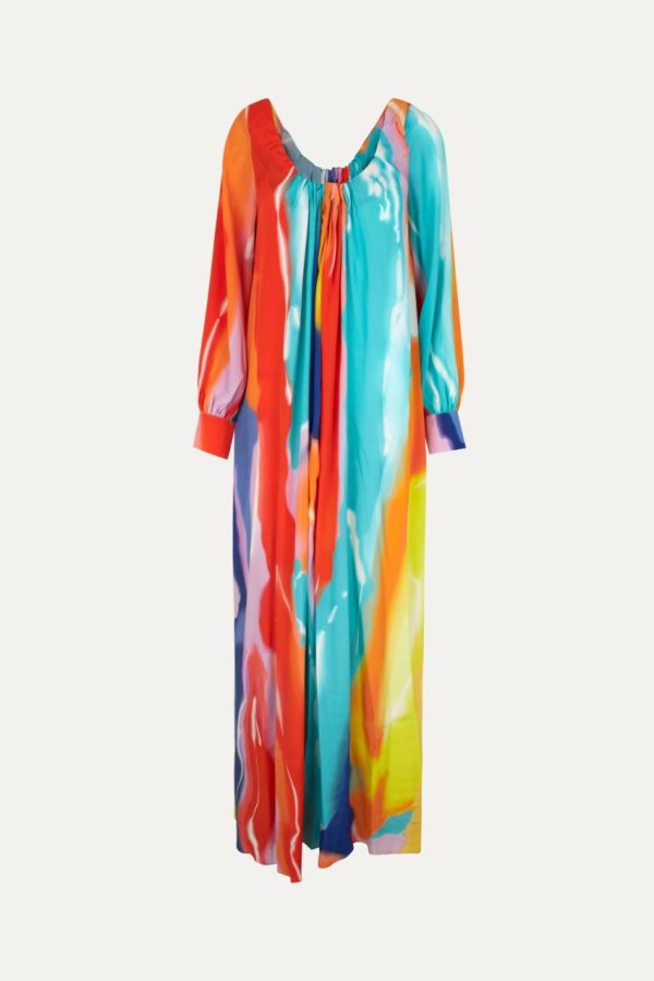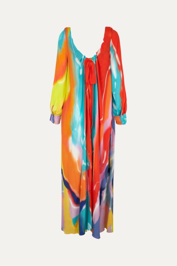 Flowy full length silk blend dress with long cuffed sleeves, front and back V-neck and bright marble pattern. Pair with the Jet Set Heels in Fiery Red.