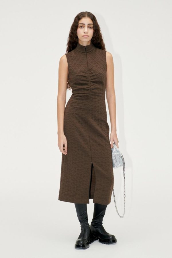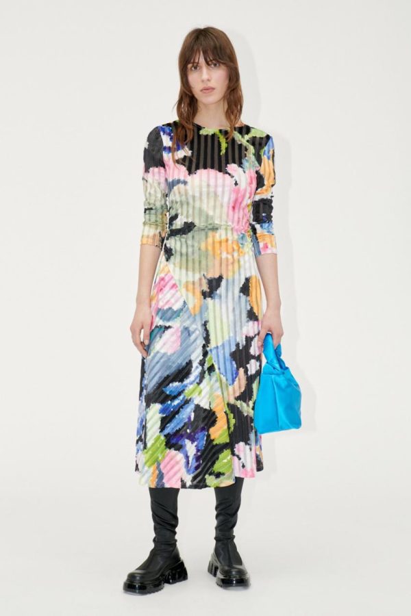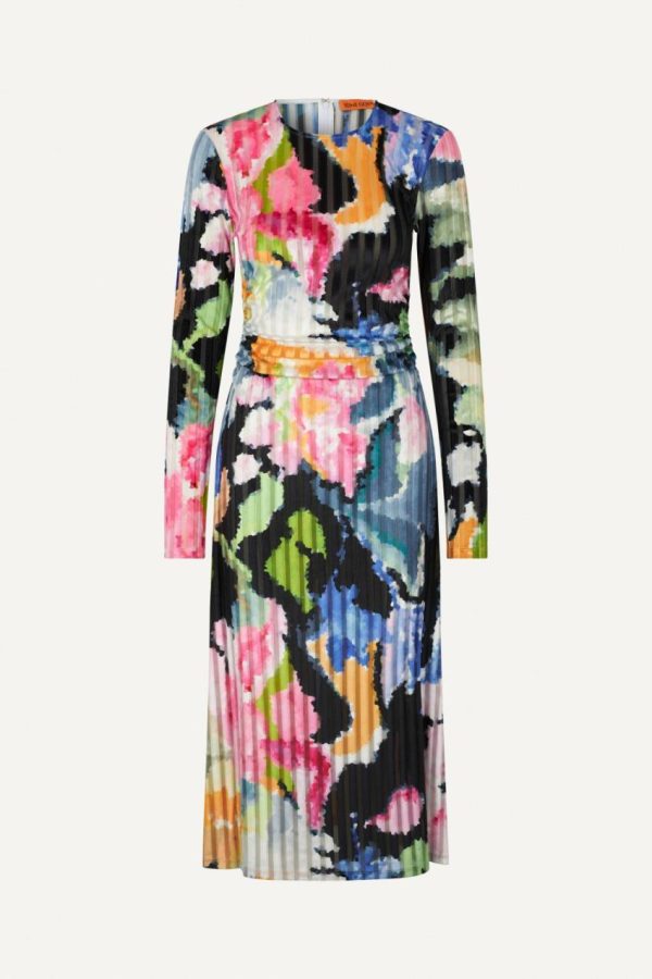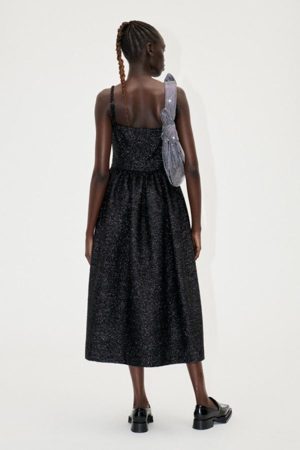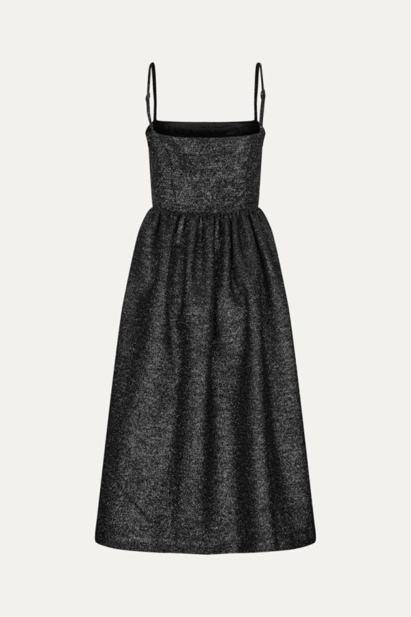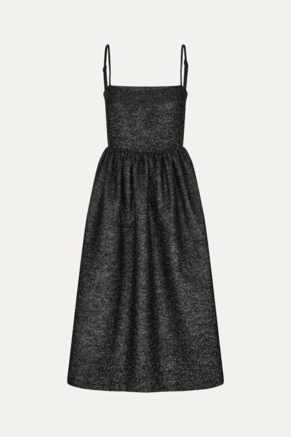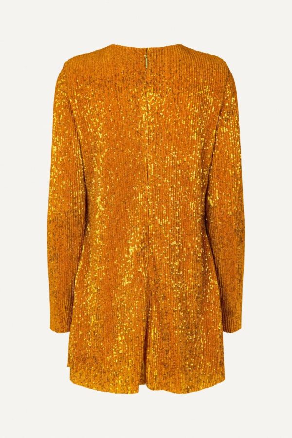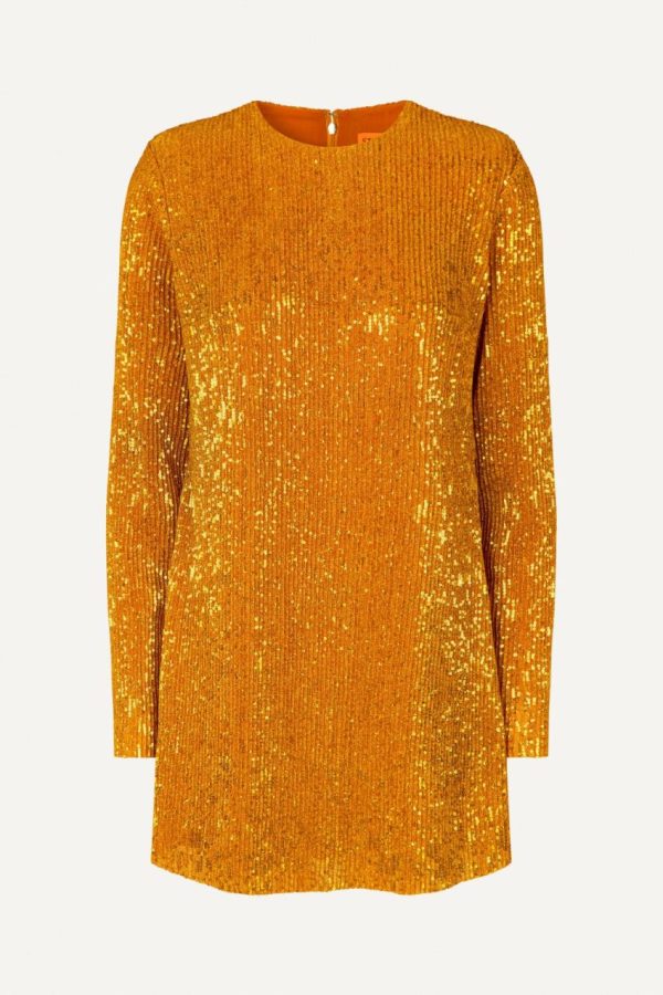 Relaxed fitting mini dress with straight silhouette, long sleeves and crewneck. All over bright metallic sequins. Fully lined. Pair with the Markus Pants in Gold and Eiffel Shoes in Gold.