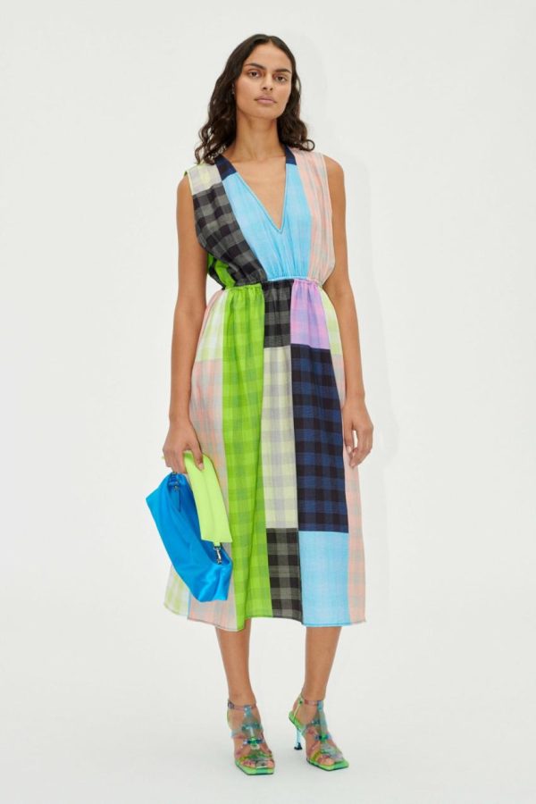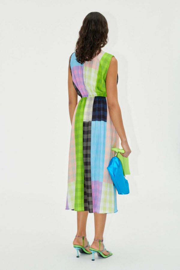 Flowy sleeveless mid-length dress with V-neck and elasticated waist. Colour blocked check pattern. Pair with your favourite shoes from the collection.