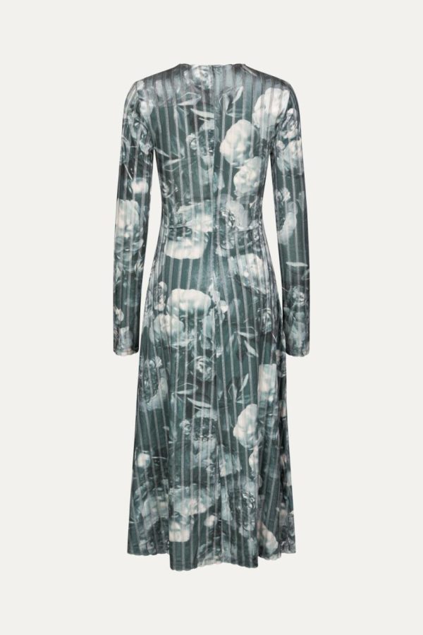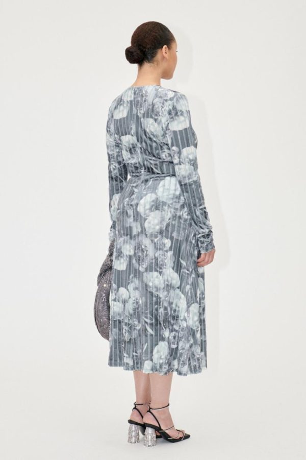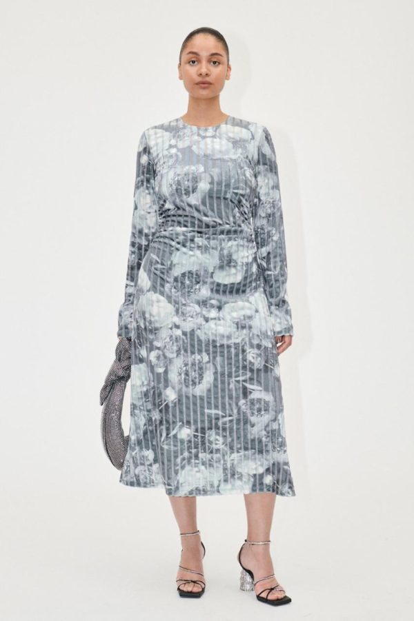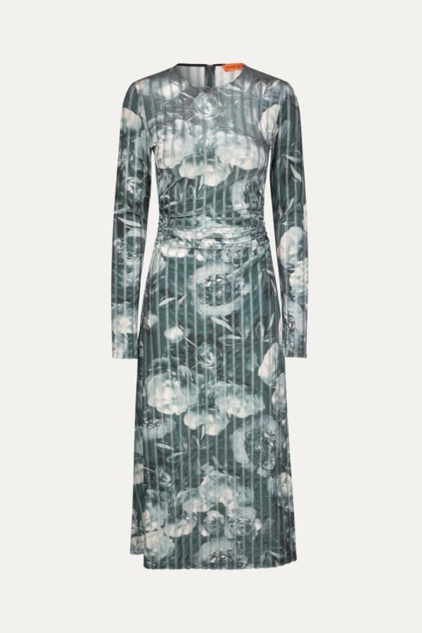 Long sleeve midi dress with flattering ruching and semi-sheer floral pattern. Recycled Polyester blend. Pair with the Allison Boots in Jet Black.