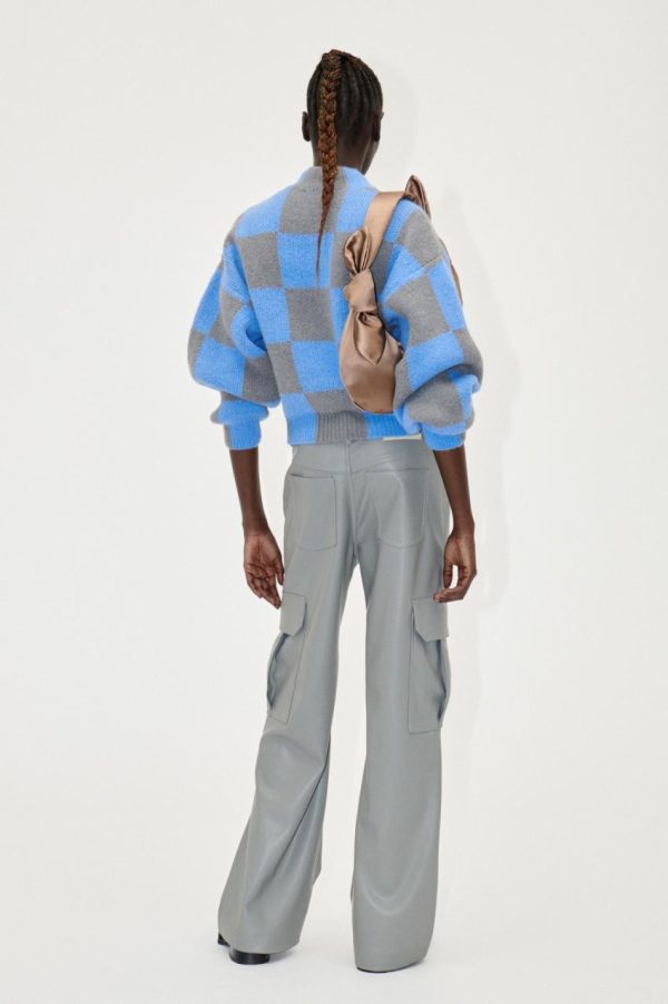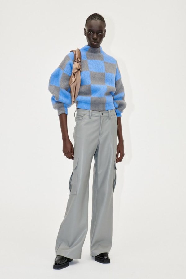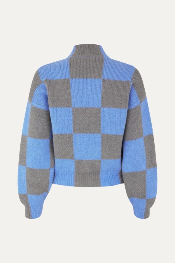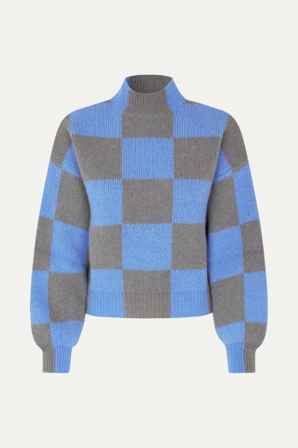 Relaxed knit sweater with ribbed turtleneck, puffed long sleeves with cuffs and checked pattern. Pair with the Stevie Pants in Grey.
