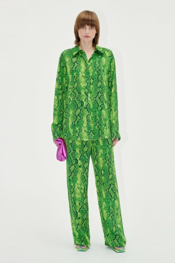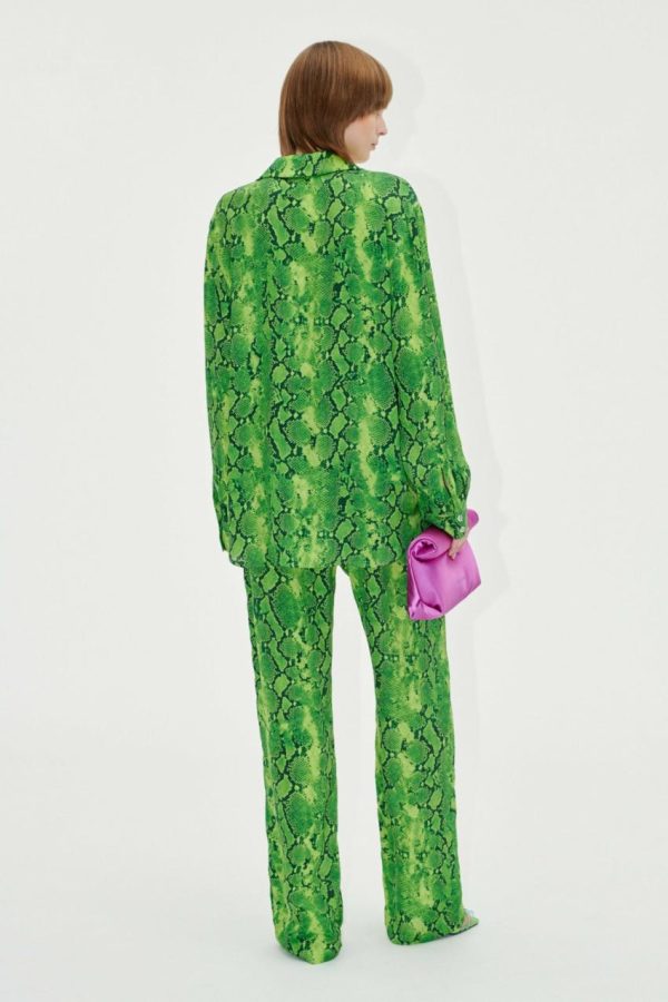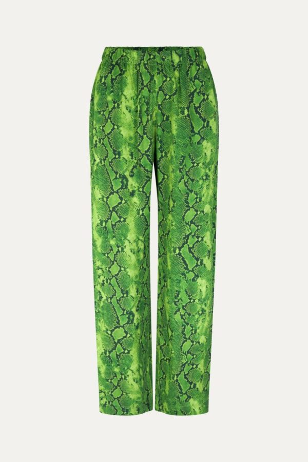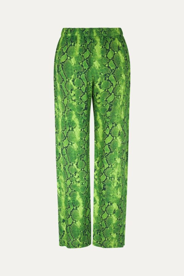 Relaxed fit pants with a wide straight leg fit, high elasticated waist and pockets. Bright snakeskin pattern. Pair with the Sophia Blouse in Snakeskin Green and the Delphine Heels in Mint Snake.