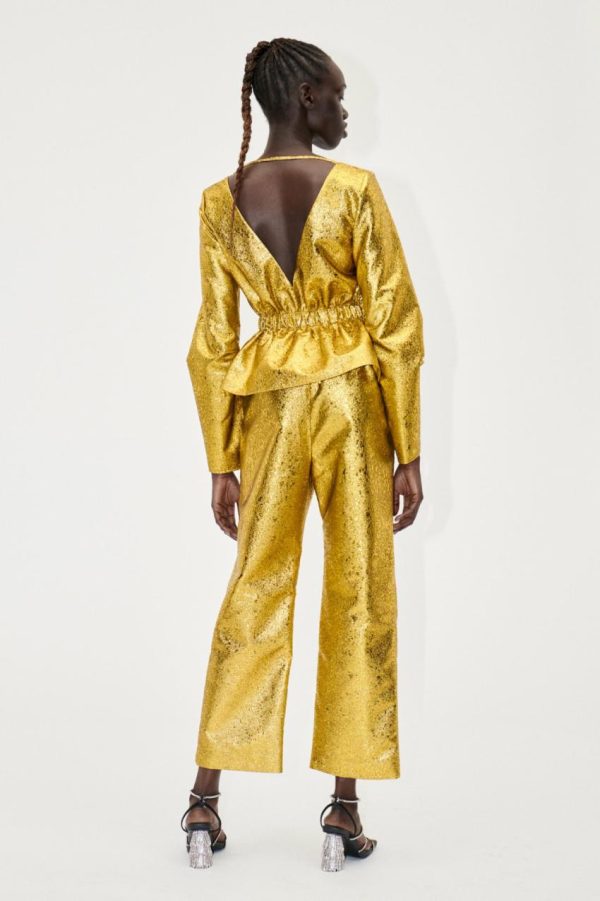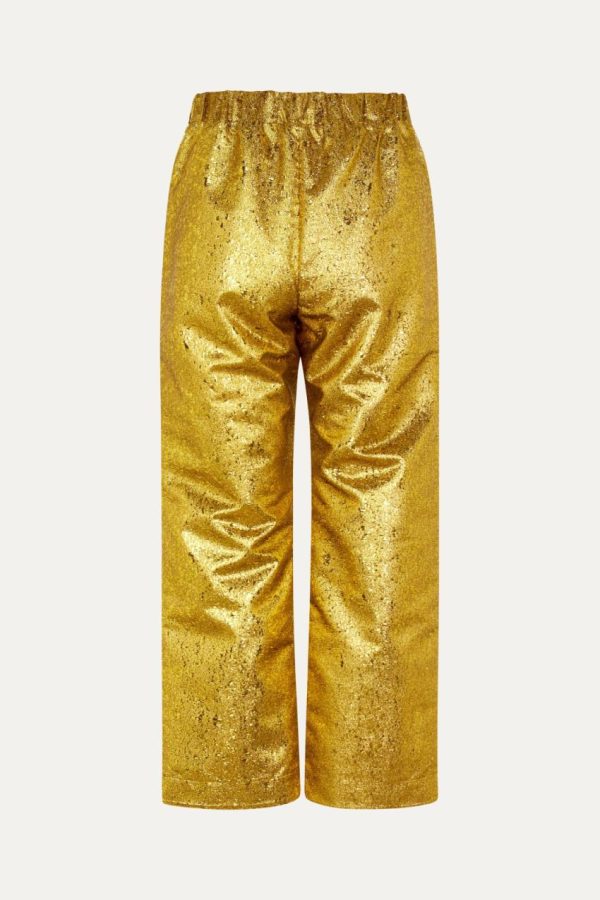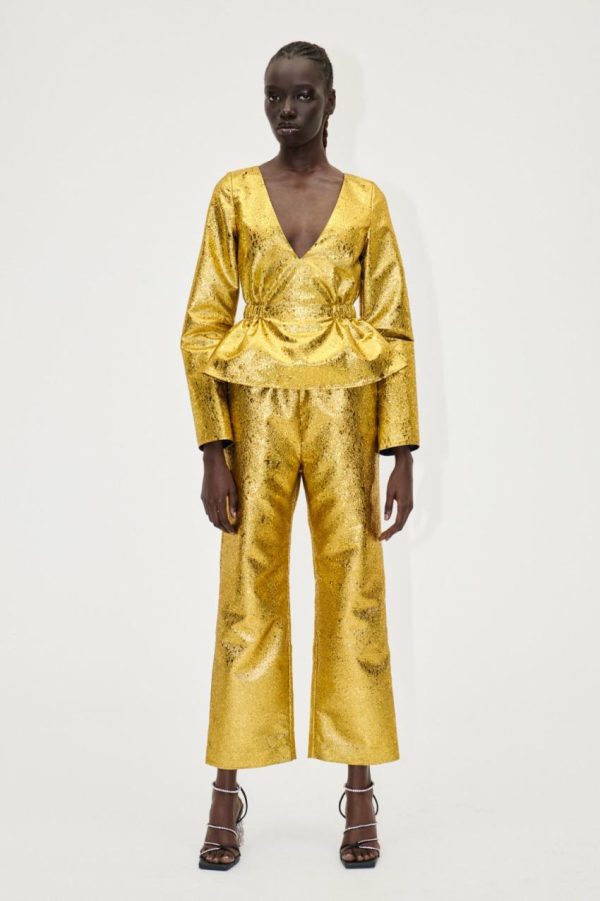Straight leg ankle length pants with a high waistline and bright gold metallic material. Recycled polyester blend. Fully lined. Pair with the Kinsley Blouse in Luminescent Gold.