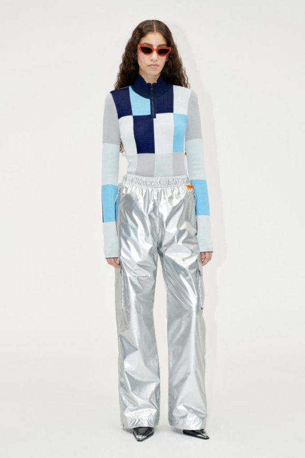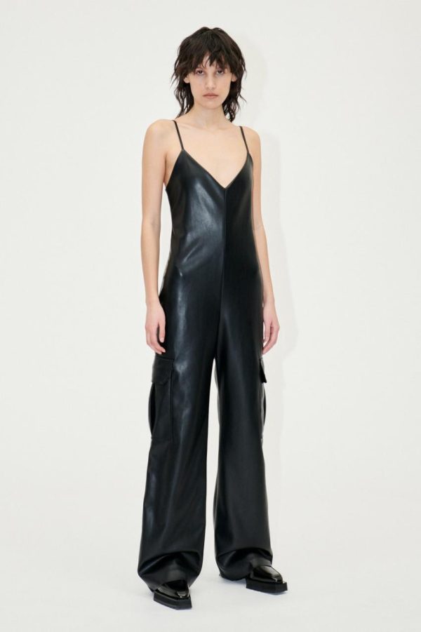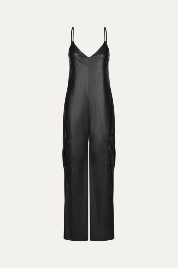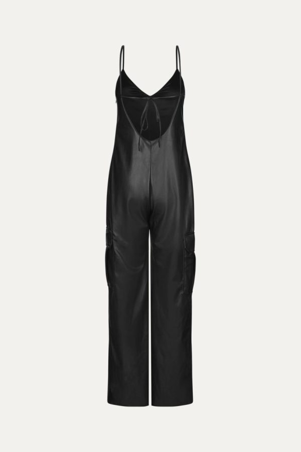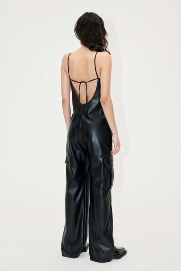 Sleeveless faux leather jumpsuit with thin straps, low back with tie detail and wide legs with patch pockets. 100% Recycled Polyester. Fully lined with 100% Recycled Polyester. Pair with the Gurly Shoes in Jet Black.