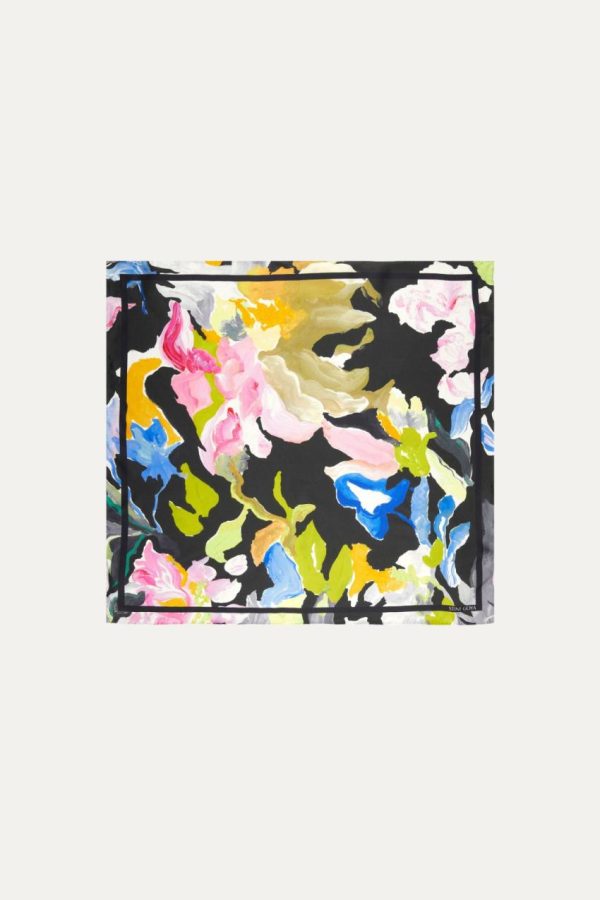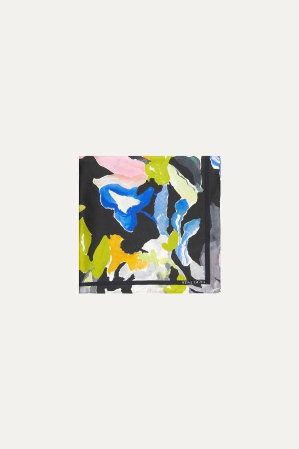 Bright square silk scarf with floral pattern, border and STINE GOYA logo detail. Made of 100% Silk. Wear the scarf around your neck, in your hair or on your bag as a colourful accessory.