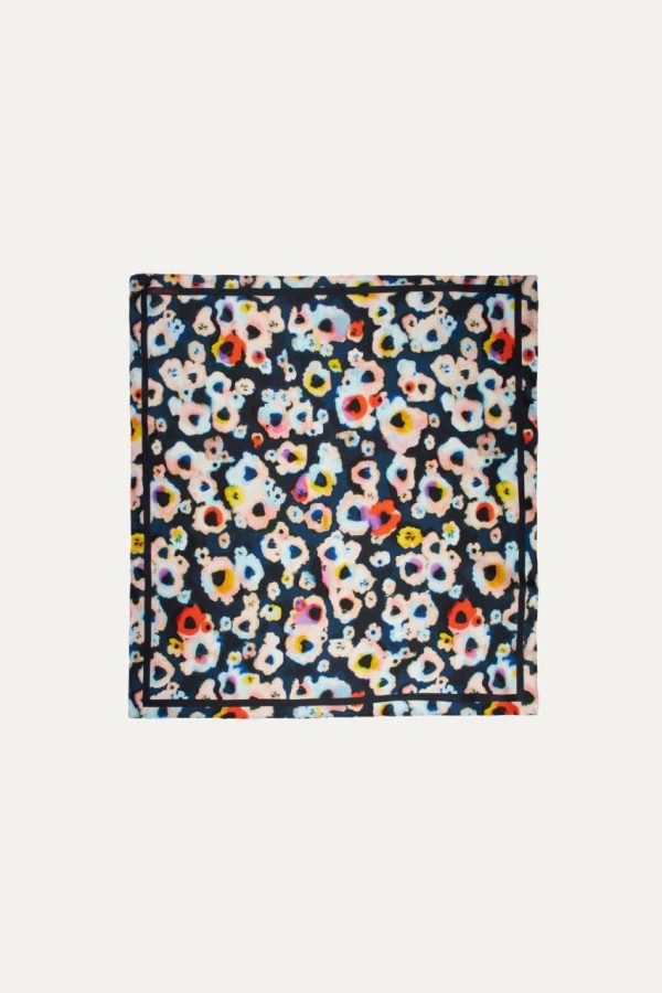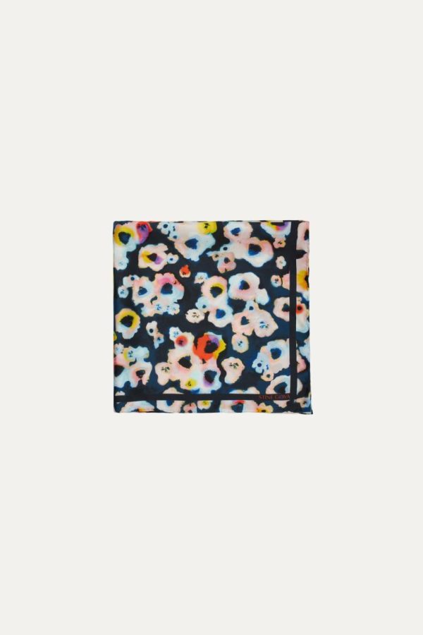 Lightweight square silk scarf with abstract floral pattern and simple border. Made of 100% Silk. Wear the scarf around your neck, in your hair or on your bag as a colourful accessory.