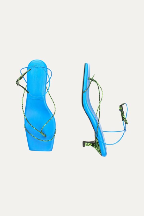 Simple strappy sandals with kitten heel, squared toe and comfortable sole. Patterned straps with buckle closure.