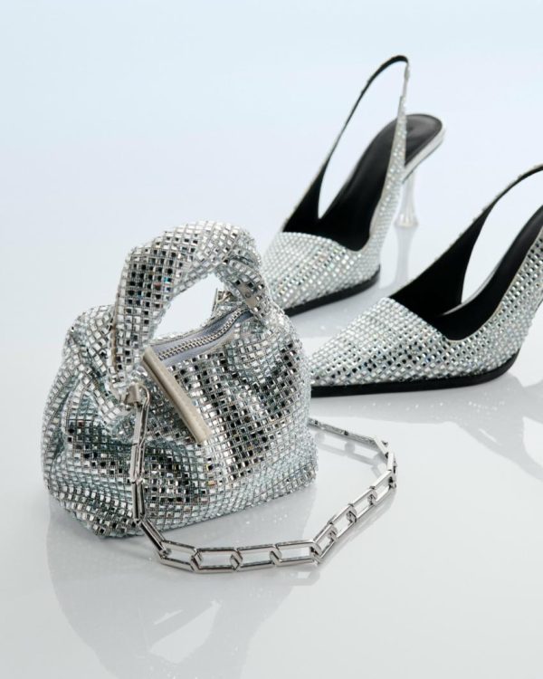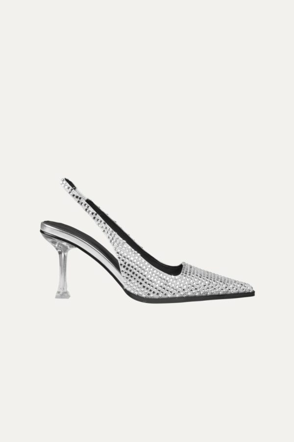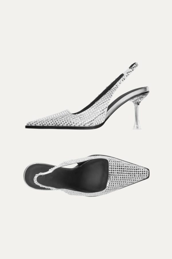 Elegant sling back heels with thin mid-height heel, squared pointed toe and silver mirrored material. Comfortable sole.