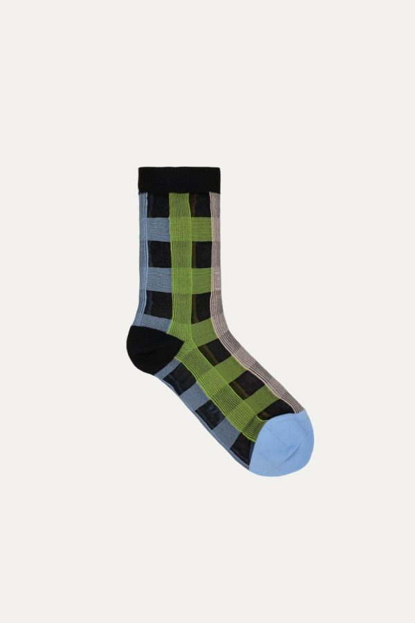 Simple crew socks with colour blocked heel and toe patches, ribbed cuff and check pattern with transparent detail.