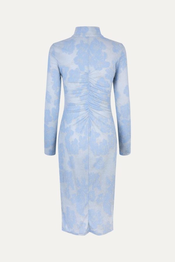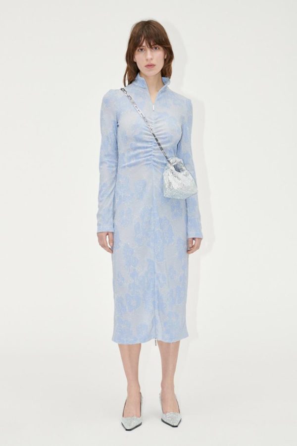 Elegant slim fit midi dress featuring a sophisticated collar design and stylish front slit zippers, with graceful long sleeves and a beautiful floral pattern. Crafted from sustainable Recycled Polyester blend for eco-conscious style. Perfectly pairs with the Eiffel Shoes in Silver for a complete fashionable look.
