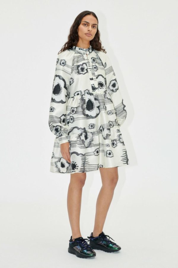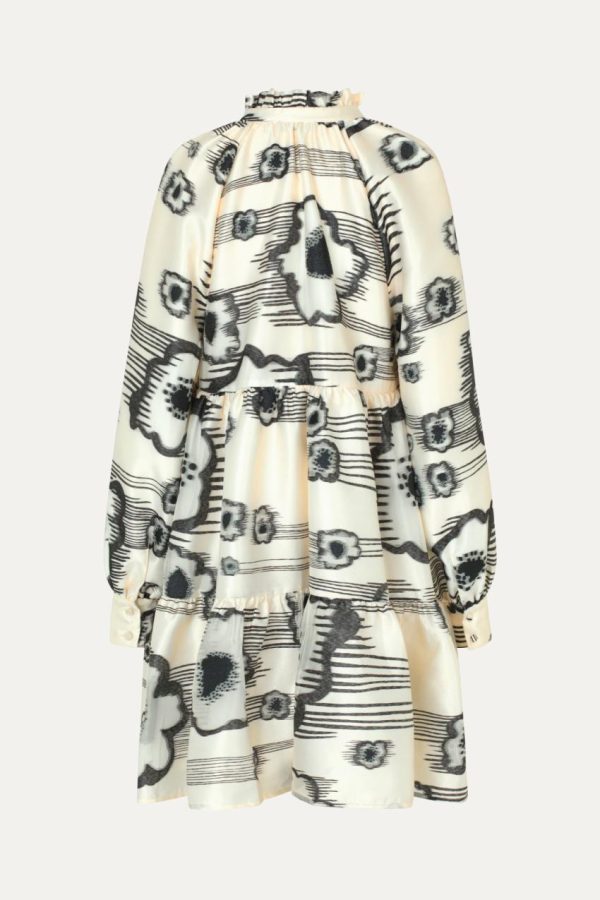 Elevate your style with this beautifully tiered mini dress featuring elegant cuffed long sleeves, a stunning floral pattern, and convenient side pockets. Crafted from premium recycled polyester blend for both style and sustainability. Perfectly pairs with your favorite shoes from our collection.