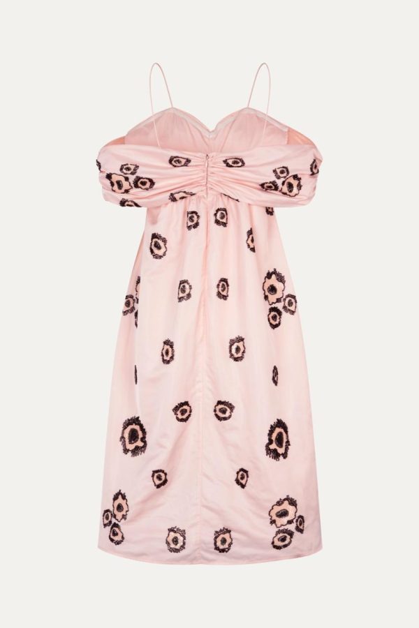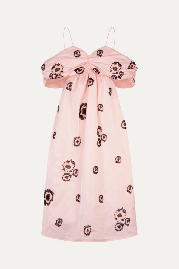 Elevate your wardrobe with this effortlessly chic midi dress featuring a beautifully draped off-the-shoulder neckline and delicate floral pattern. 100% Recycled Polyester. Perfectly complements our Crystal Shoes in Rose Quartz for a complete look.