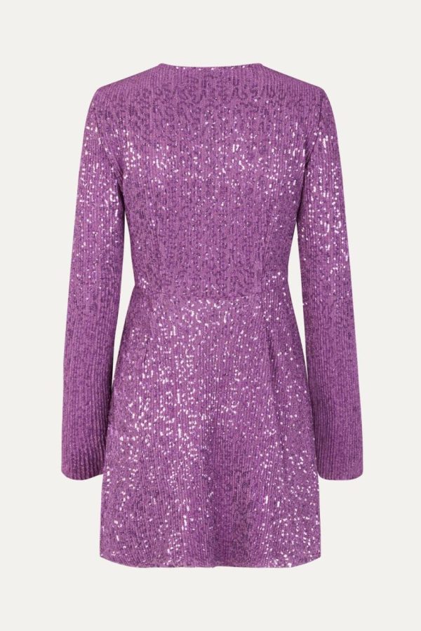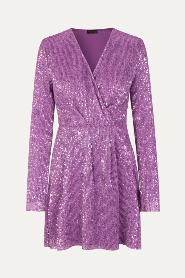Make a dazzling statement in this brilliant mini dress featuring a flattering V-neck wrap design, sophisticated long sleeves, and exquisite pleating details. Crafted with all-over sequined material that catches the light beautifully. Perfectly complements our Crystal Heels in Rose Quartz for a complete glamorous look