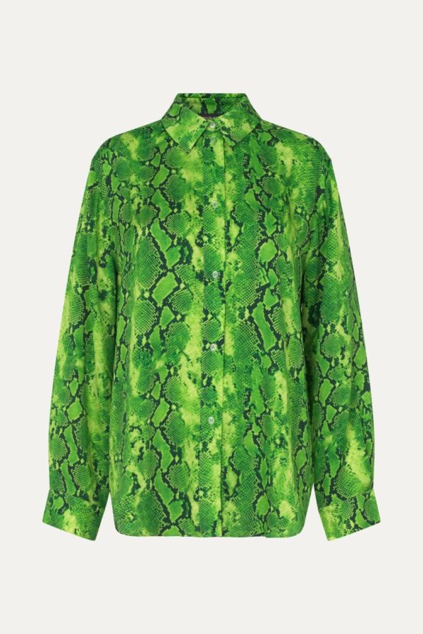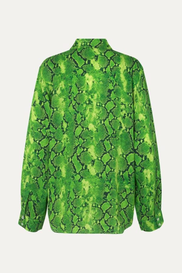 Elevate your wardrobe with this effortlessly chic button-down blouse featuring a graceful flowing silhouette and statement-making snakeskin pattern. The elegant long cuffed sleeves and classic collar create a polished look perfect for both professional settings and casual outings. Designed to pair beautifully with our Fatou Pants in Snakeskin Green for a complete ensemble.