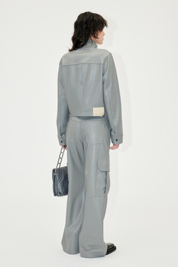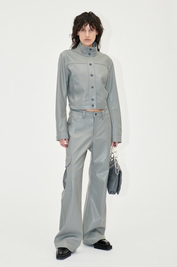 Elevate your wardrobe with these sophisticated wide leg pants featuring a flattering high waist design, practical thigh patch pockets, and a sleek front zip closure. Crafted from premium faux leather material made from 100% Recycled Polyester for an eco-conscious choice. Fully lined with 100% Recycled Polyester for comfortable wear. Style with the Saige Jacket in Grey and the Gurly Shoes in Jet Black for a complete fashion-forward look.