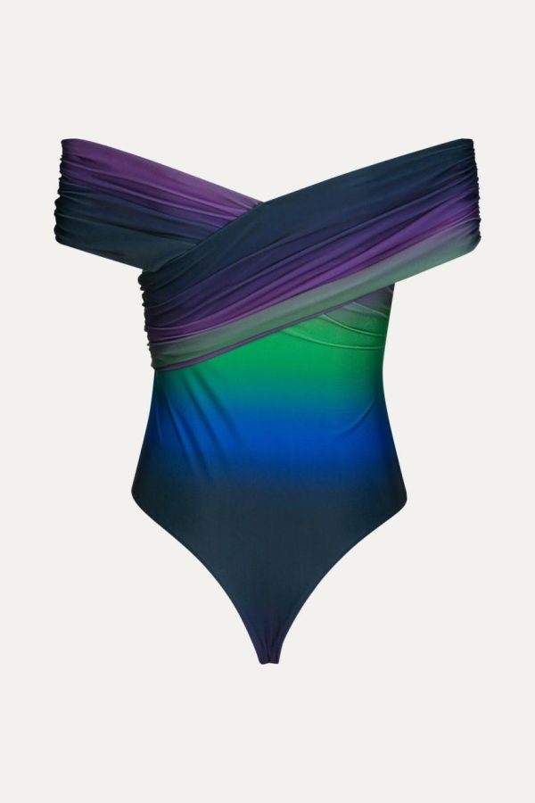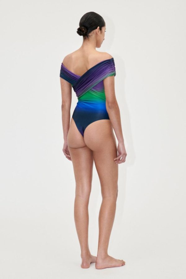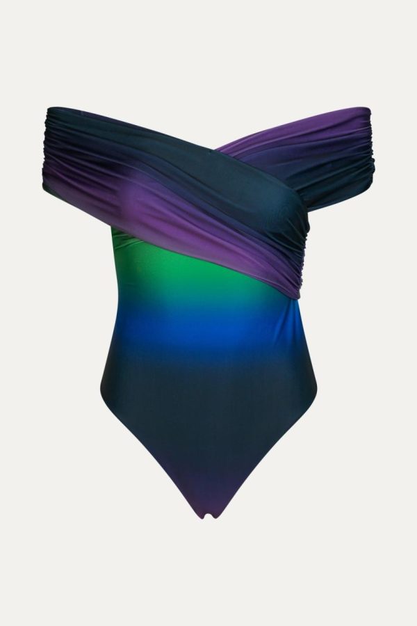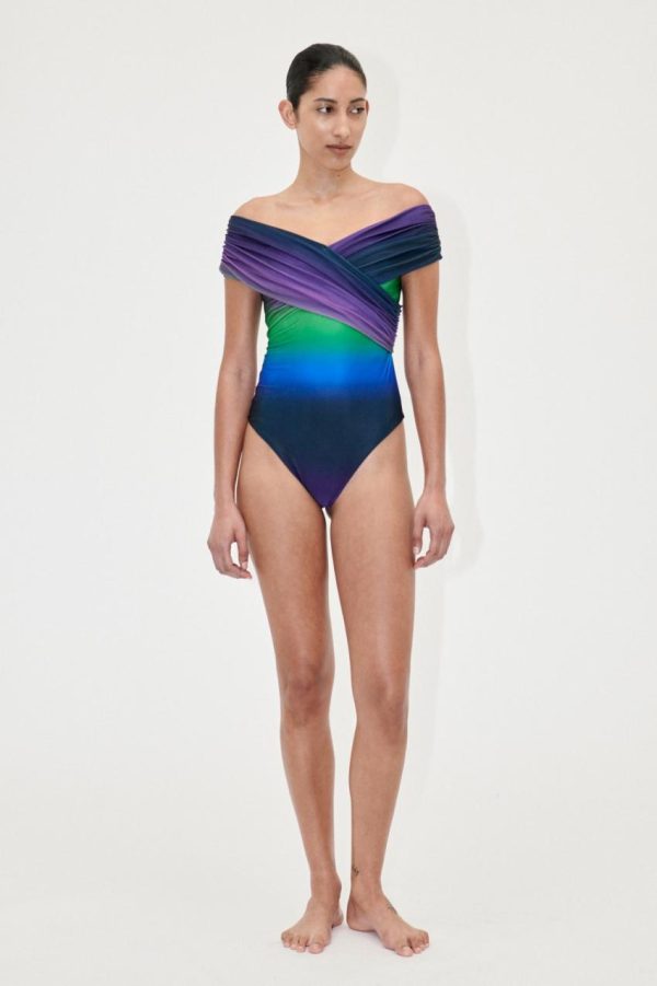Experience ultimate comfort in this elegant one-piece swimsuit featuring a chic wrapped off-the-shoulder neckline and stunning ombre detailing. Crafted from premium recycled materials for eco-conscious style. Perfectly complements your favorite beach accessories from our collection.