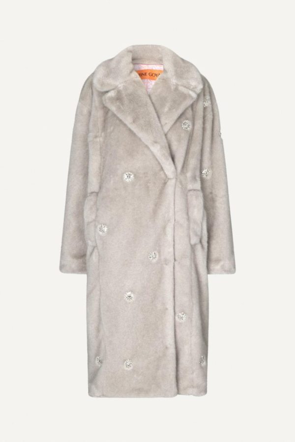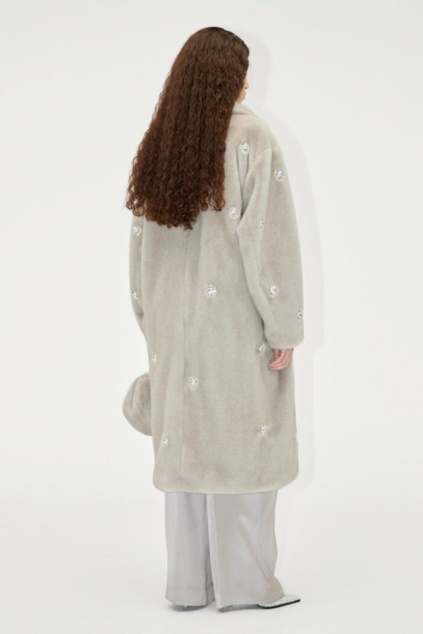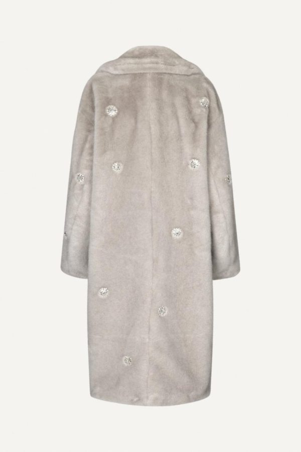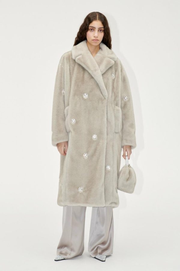 Make a sophisticated statement with our oversized mid-length coat featuring exquisite crystal detailing, convenient side pockets, and sumptuous faux fur material. 100% Recycled Polyester. Perfect for layering over your favorite looks from our collection.