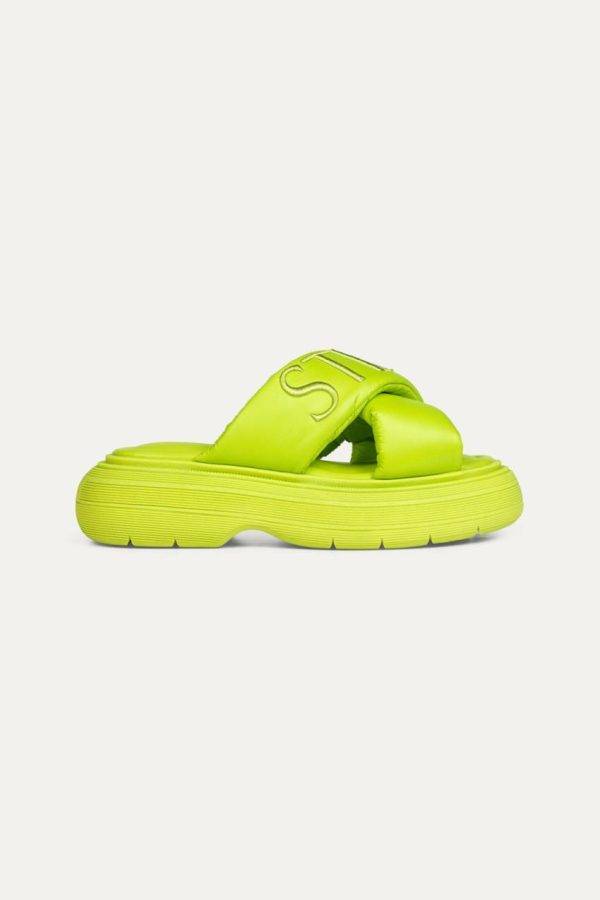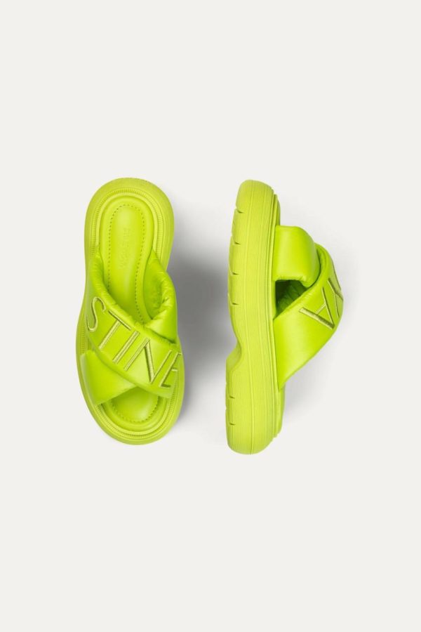 Elevate your style with these chunky slip-on sandals featuring comfortable padded cross straps, distinctive stitched STINE GOYA logo detailing, and plush ribbed platform soles for ultimate comfort.