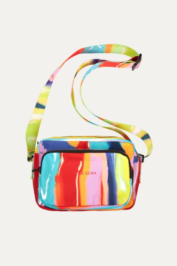Eye-catching boxy crossbody bag featuring a wide adjustable strap and sophisticated all-over marbled pattern. 100% Recycled Polyester.