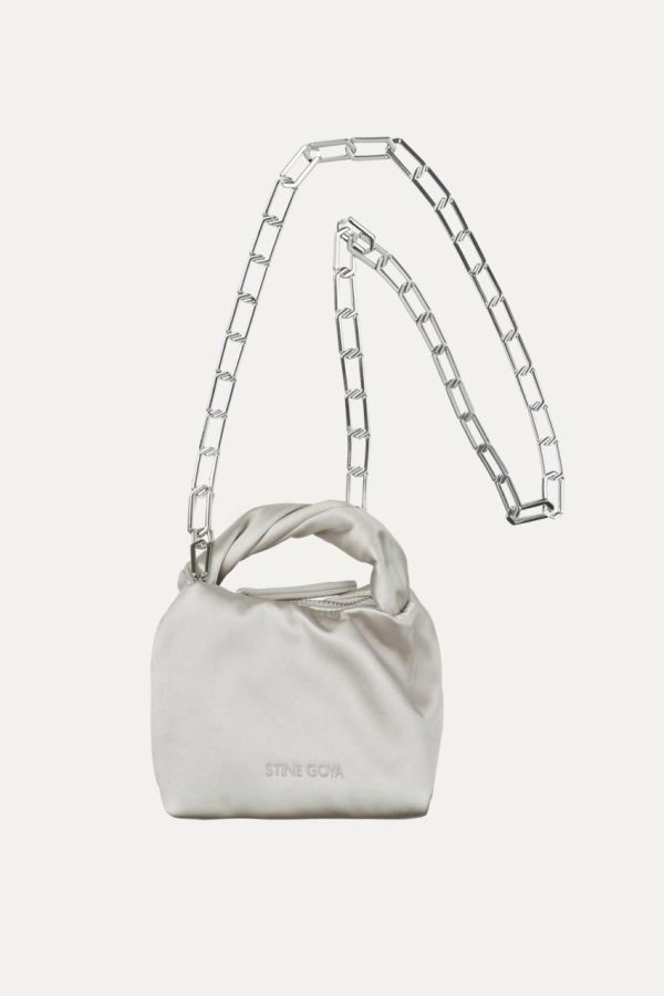 Discover this beautifully slouchy micro bag featuring an elegant twisted top handle, versatile long crossbody chain strap, and secure zip-closure pocket. Crafted from luxurious sheened satin material for a sophisticated look.