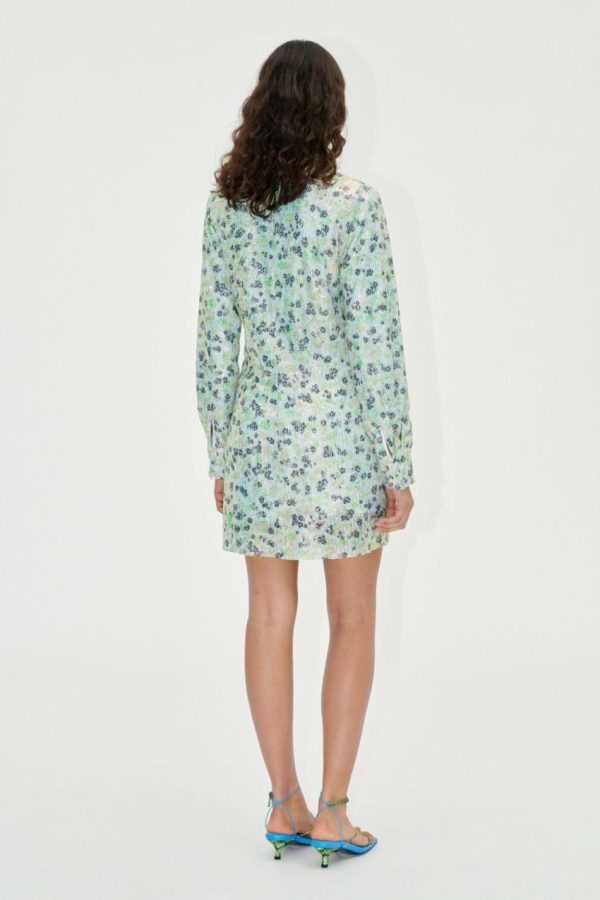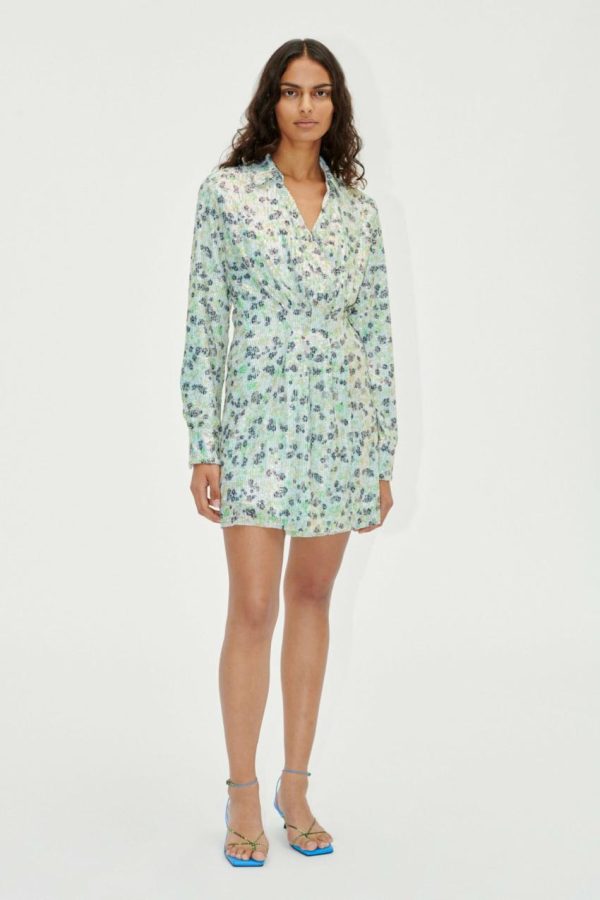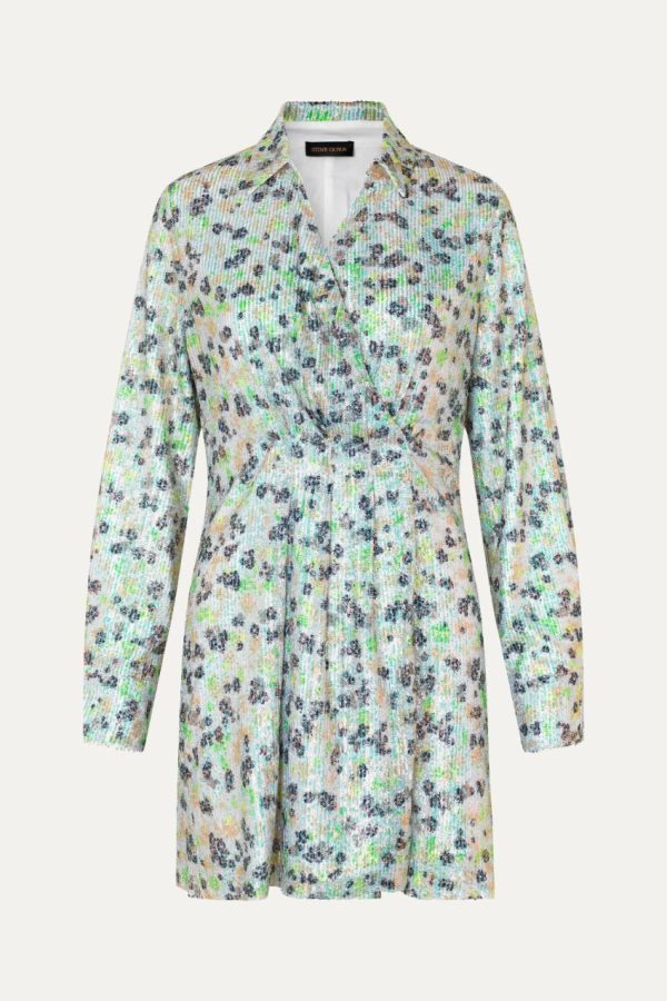 Elevate your evening wardrobe with this stunning mini dress featuring a flattering V-neck wrap design, elegant long sleeves, and sophisticated collar detailing. The eye-catching sequined floral pattern creates a dazzling effect that catches the light beautifully. Crafted from 100% Recycled Polyester. Features a comfortable fully lined interior for premium wearability. Perfectly pairs with the Crystal Heels in Marina for a complete elegant look.