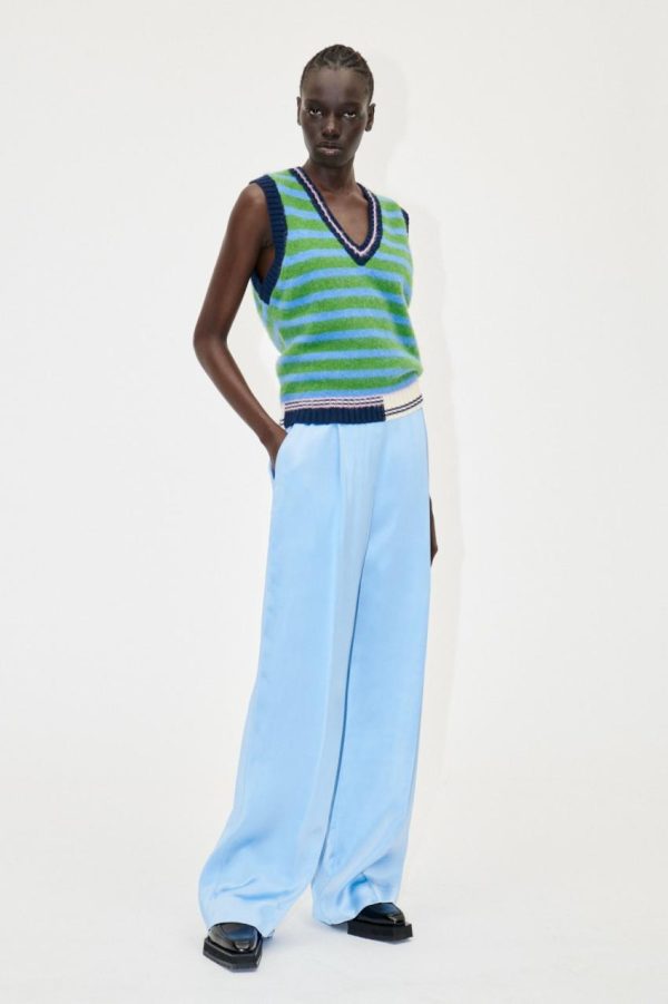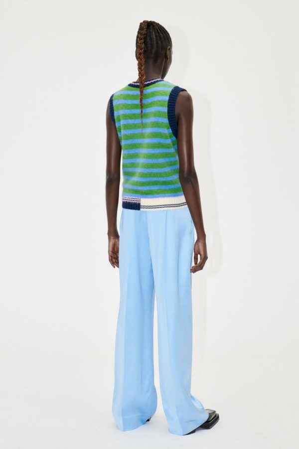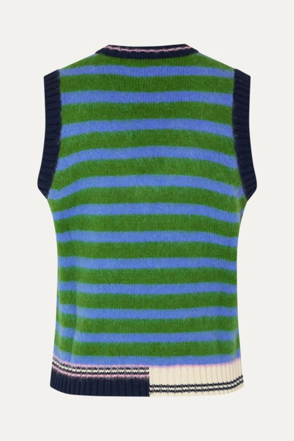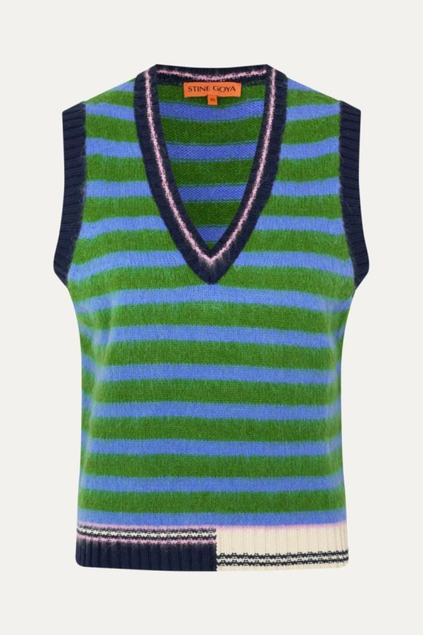 Elevate your wardrobe with this chic sleeveless sweater vest featuring a flattering V-neckline, timeless striped pattern, and substantial ribbed hem with eye-catching contrasting details. Perfectly pairs with our Paul Jeans in Stone Grey Wash for a complete stylish ensemble.