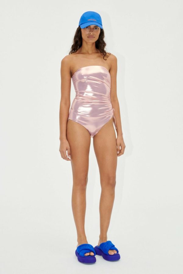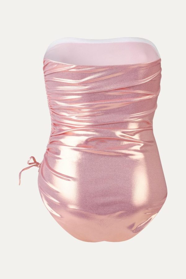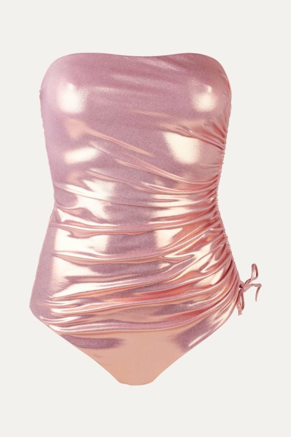 Strapless one piece with stretchy metallic material, flattering ruching and adjustable side drawstring. Fully lined. Complete the look with your favourite accessories from the collection.