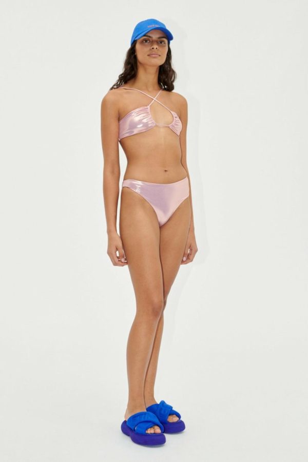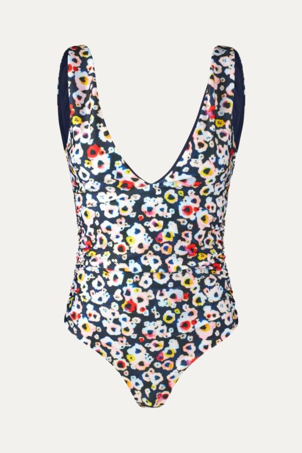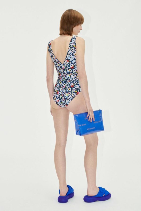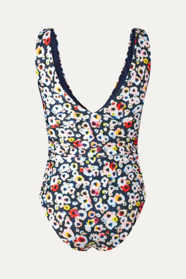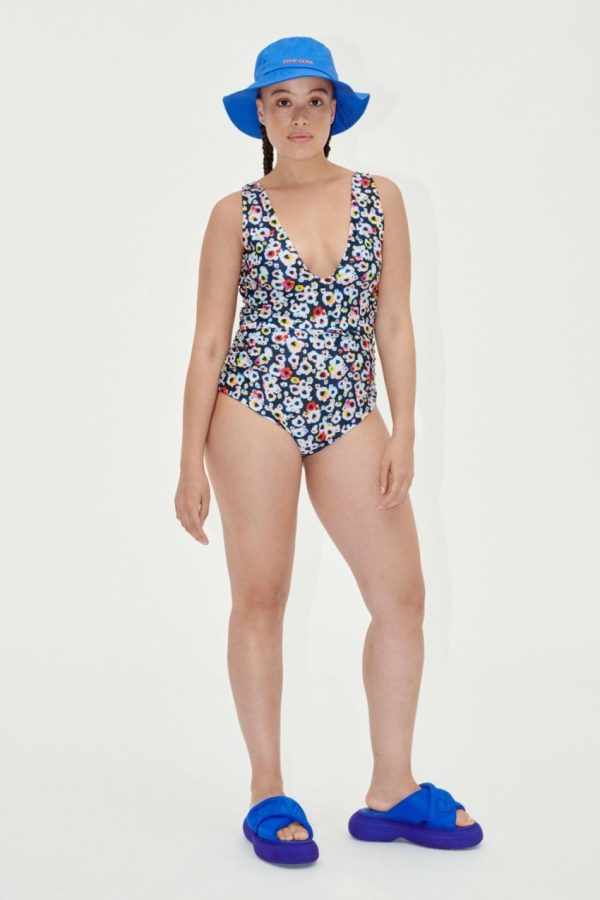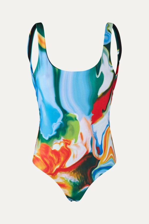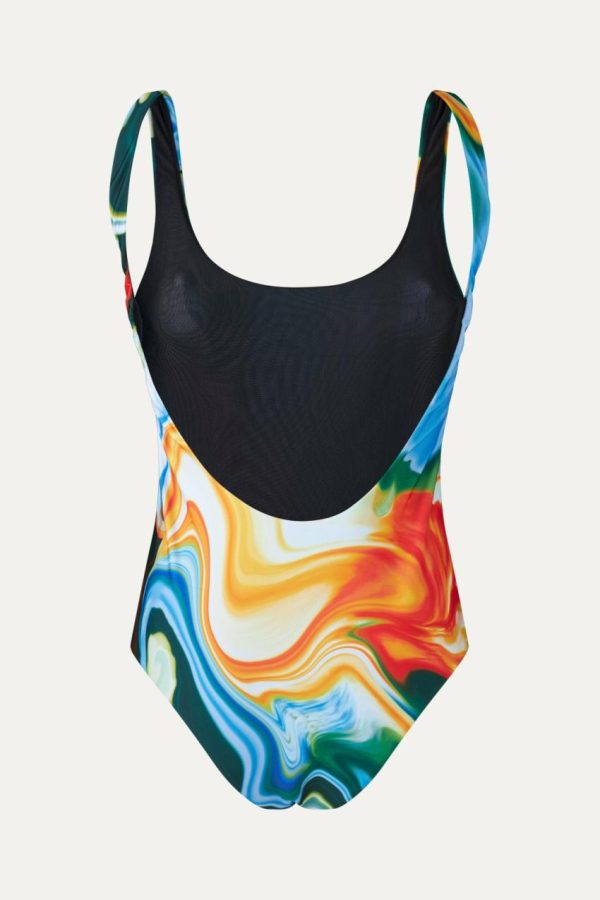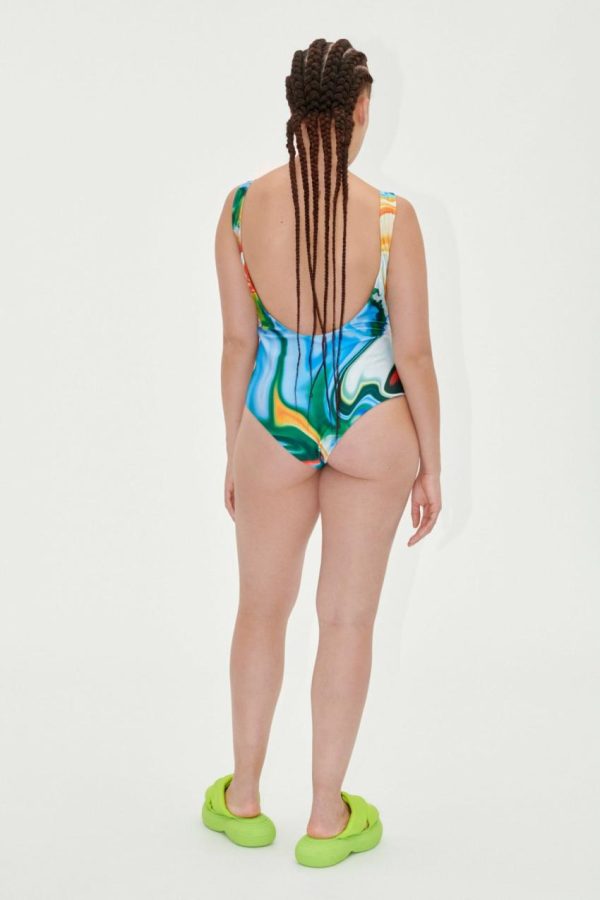 Backless one-piece swimsuit with a scoop neck, cheeky cut and marble pattern. Recycled Polyester blend. Pair with the Patri Dress in Distorted Liquid.