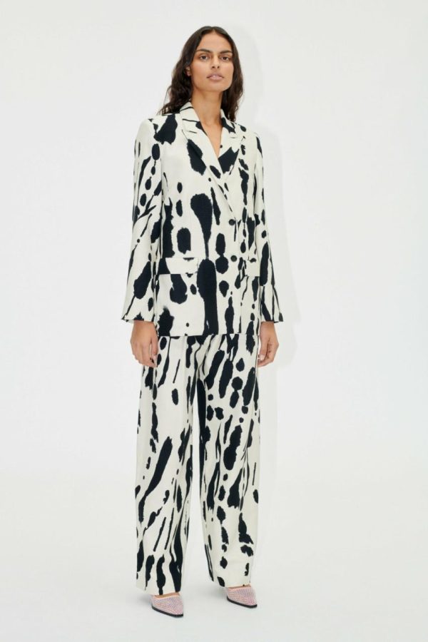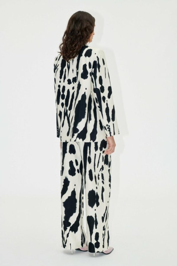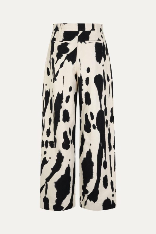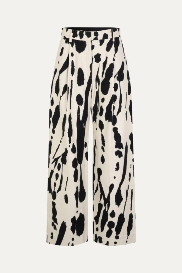 Elegant wide leg pants with a high waistline, pleating detail and simple abstract pattern. 100% Organic Cotton. Fully lined with 100% Recycled Polyester. Pair with the Steely Blazer and the Jet Set Heels in Fiery Red.
