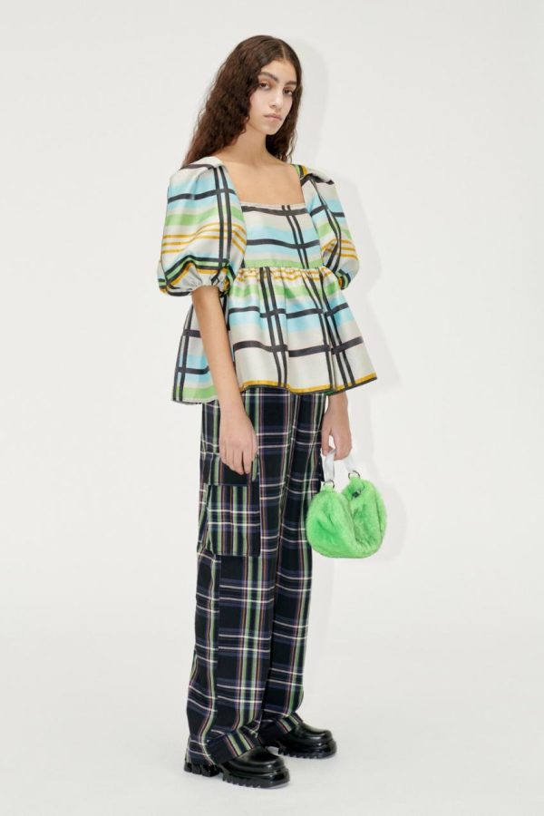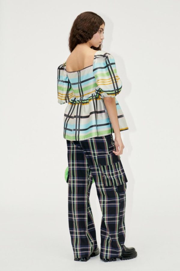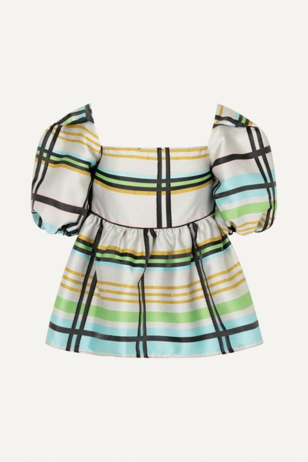 Peplum blouse with square neckline puffed short sleeves and checked pattern. Pair with the matching Isra Pants.