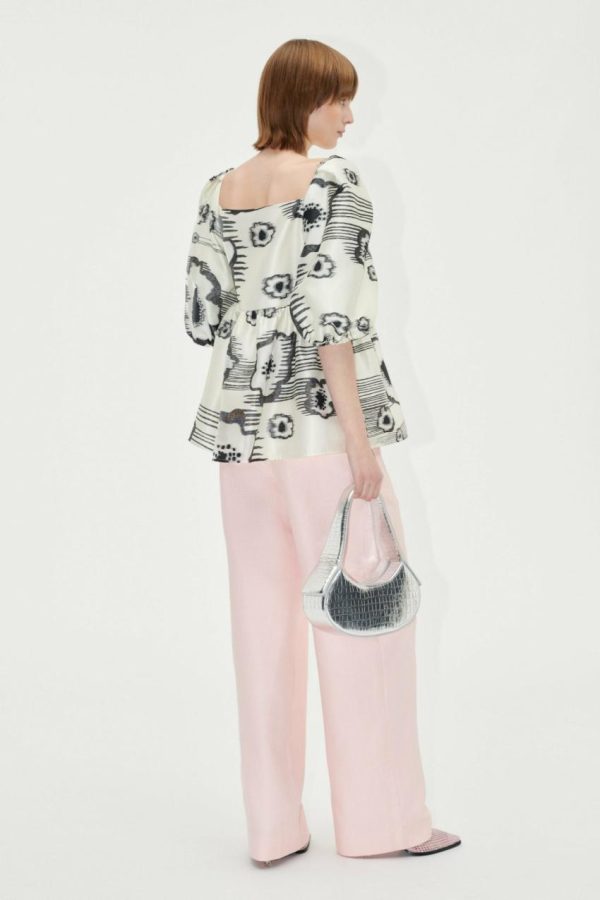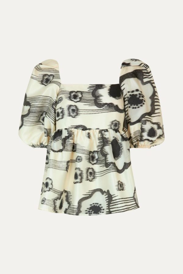 Peplum top with square neckline, puffed mid length sleeves and floral pattern. Recycled Polyester blend. Pair with the Fatou Pants in Rose Quartz.