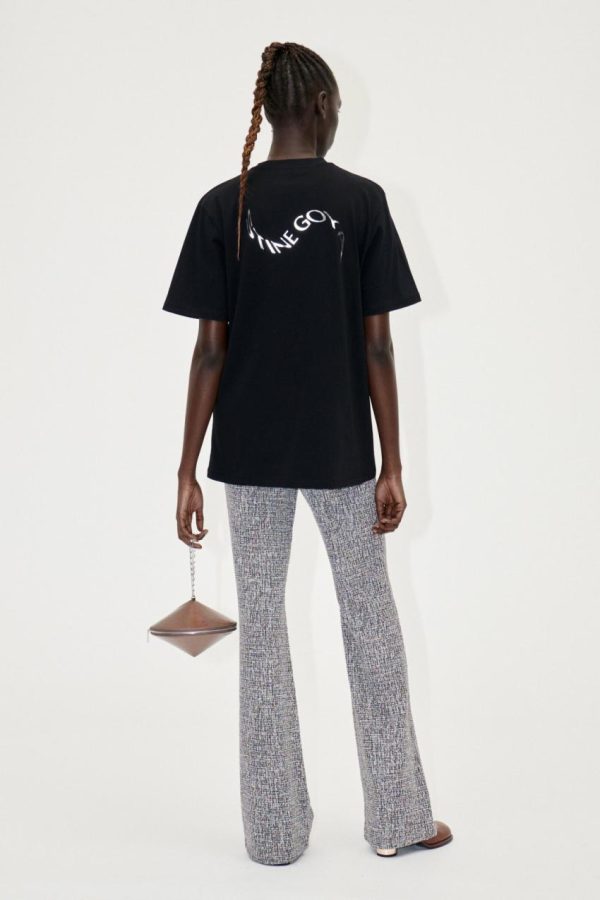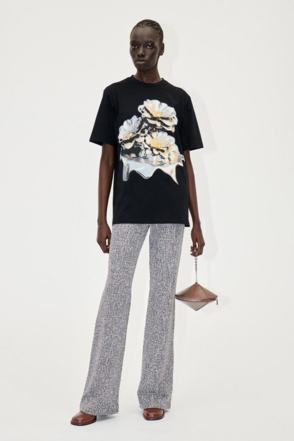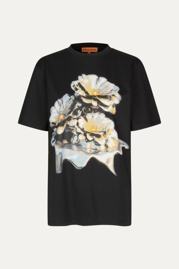 Soft boxy t-shirt with short sleeves, long hem and dripping metallic floral design. 100% Organic Cotton. Pair with the Paul Jeans in Stone Grey Wash.