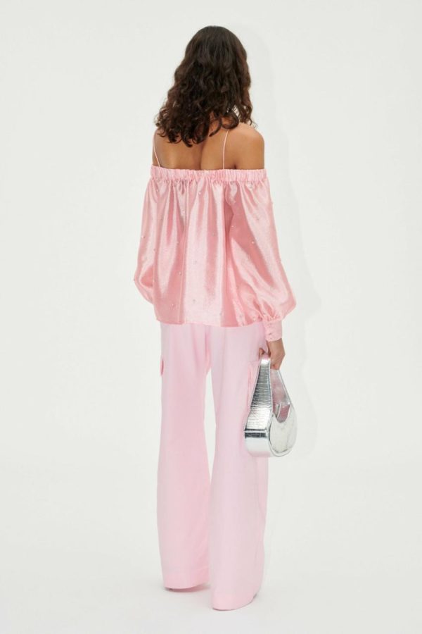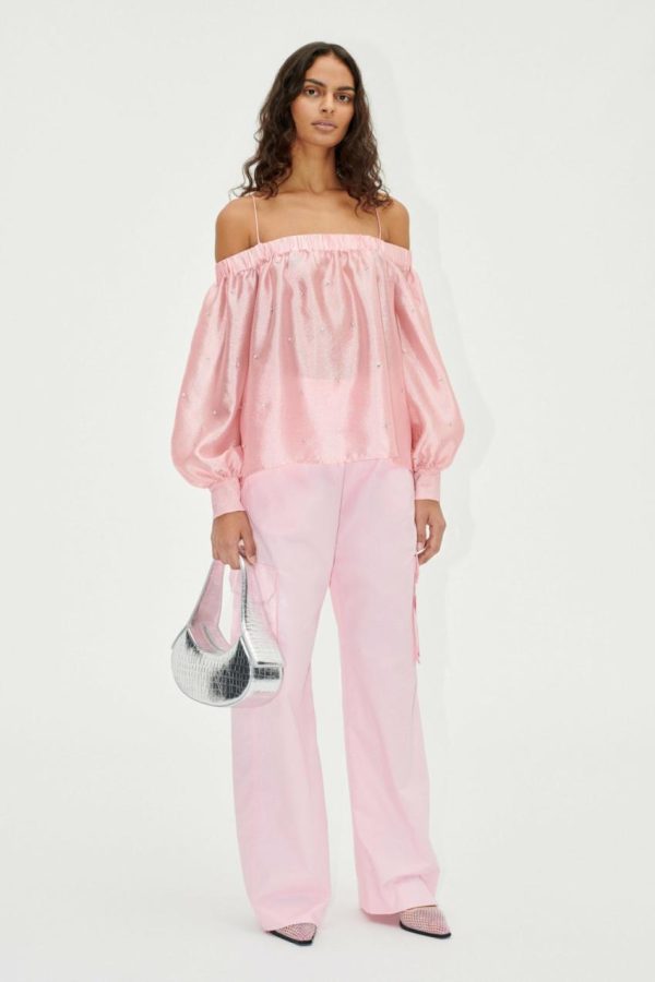 Off the shoulder top with long cuffed sleeves, thin straps and crystal details. Recycled Polyester blend. Fully lined. Pair with the Fatou Pants in Rose Quartz.